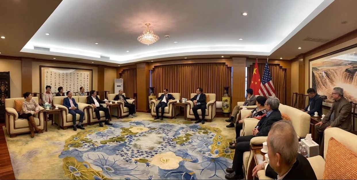中國駐洛杉磯總領館副總領事莊志哲、領僑處主任湯長安接待了林輝勇一行。莊志哲對林輝勇的連任表示祝賀。