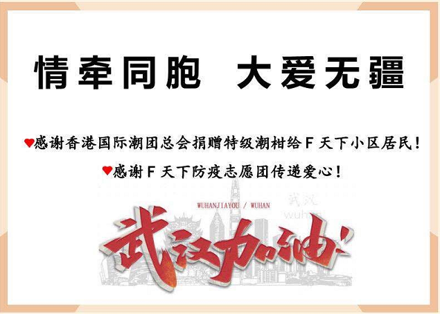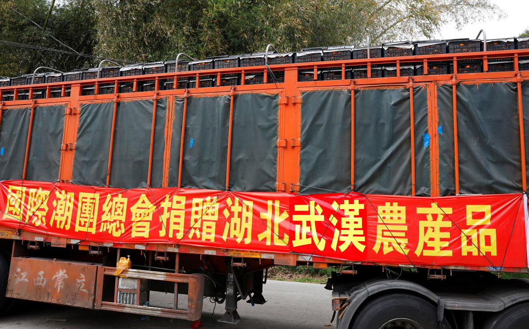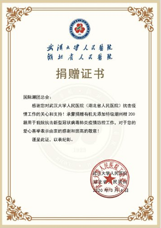 2020年3月3日,國際潮團總會特意在家鄉潮州,精選年後當造的潮州樵柑數十噸,送予武漢前線醫護人員品嘗,感謝醫護人員救死扶傷,無懼無畏。