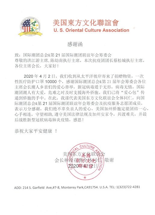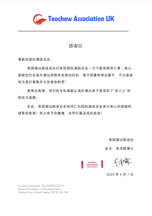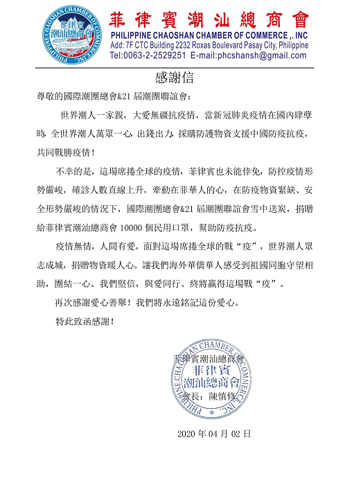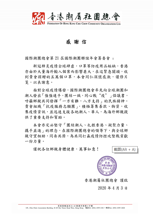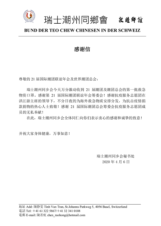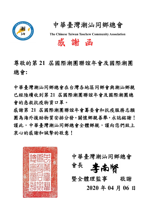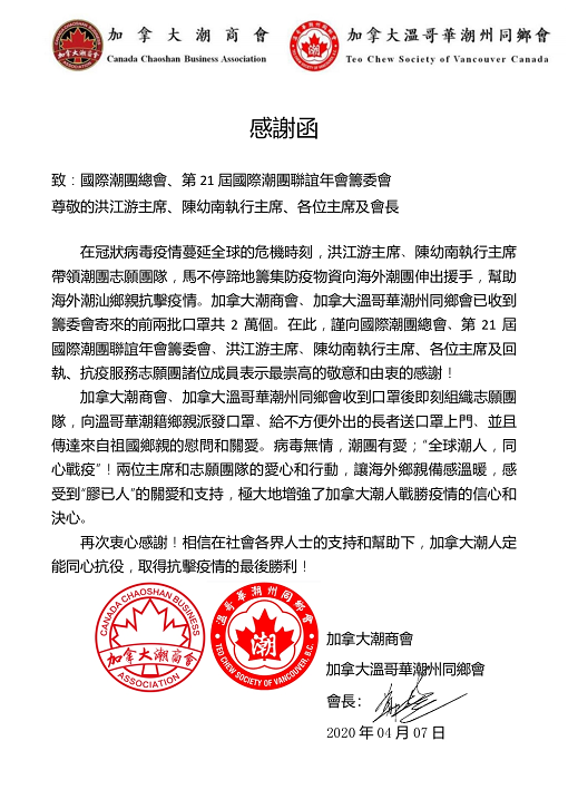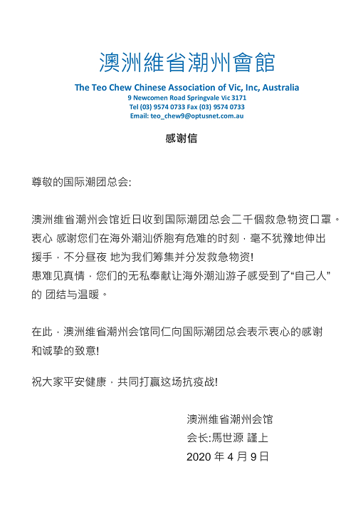 海外/港澳台地区潮團的感謝信(4月10日之前收到)