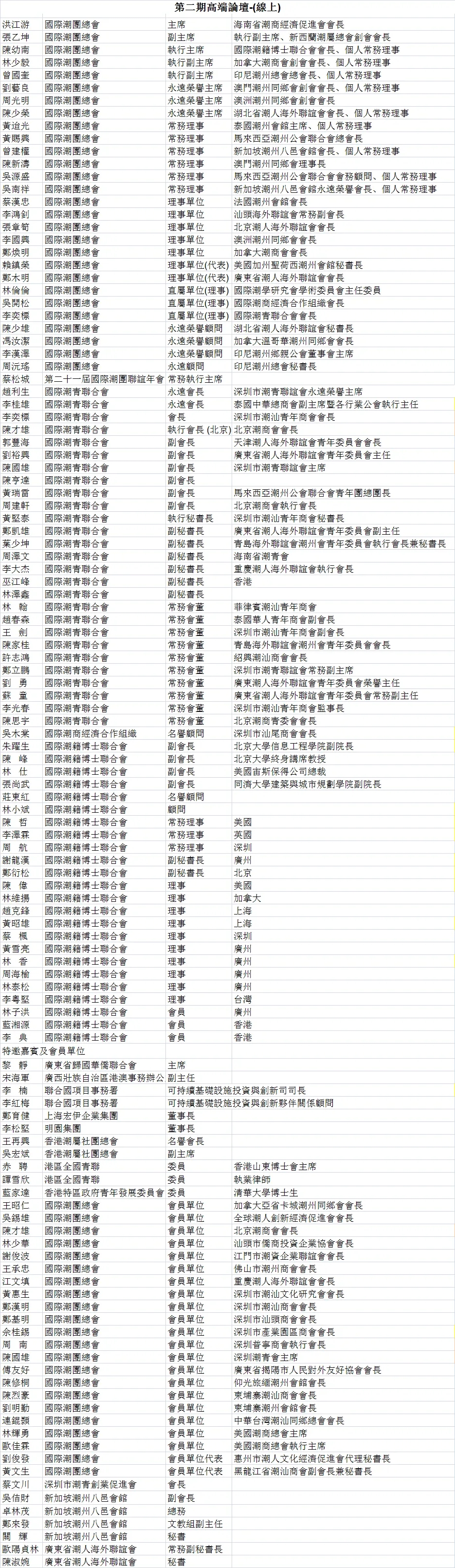 出席論壇線上線下的主要潮團首領有:國際潮團總會主席洪江遊,副主席張乙坤,執行副主席林少毅、曾國奎,永遠榮譽主席劉藝良、周光明、陳少榮,常務理事黃迨光、黃賜興、曾建權、陳新濤、吳源盛、吳南祥,理事單位蔡漢忠、李鴻釗、張章筍、李國興、鄭煥明,理事單位代表賴鎮榮、鄭木明,直屬單位(理事)林倫倫、吳開松、李奕標,以及屬下多個會員單位出席論壇活動。