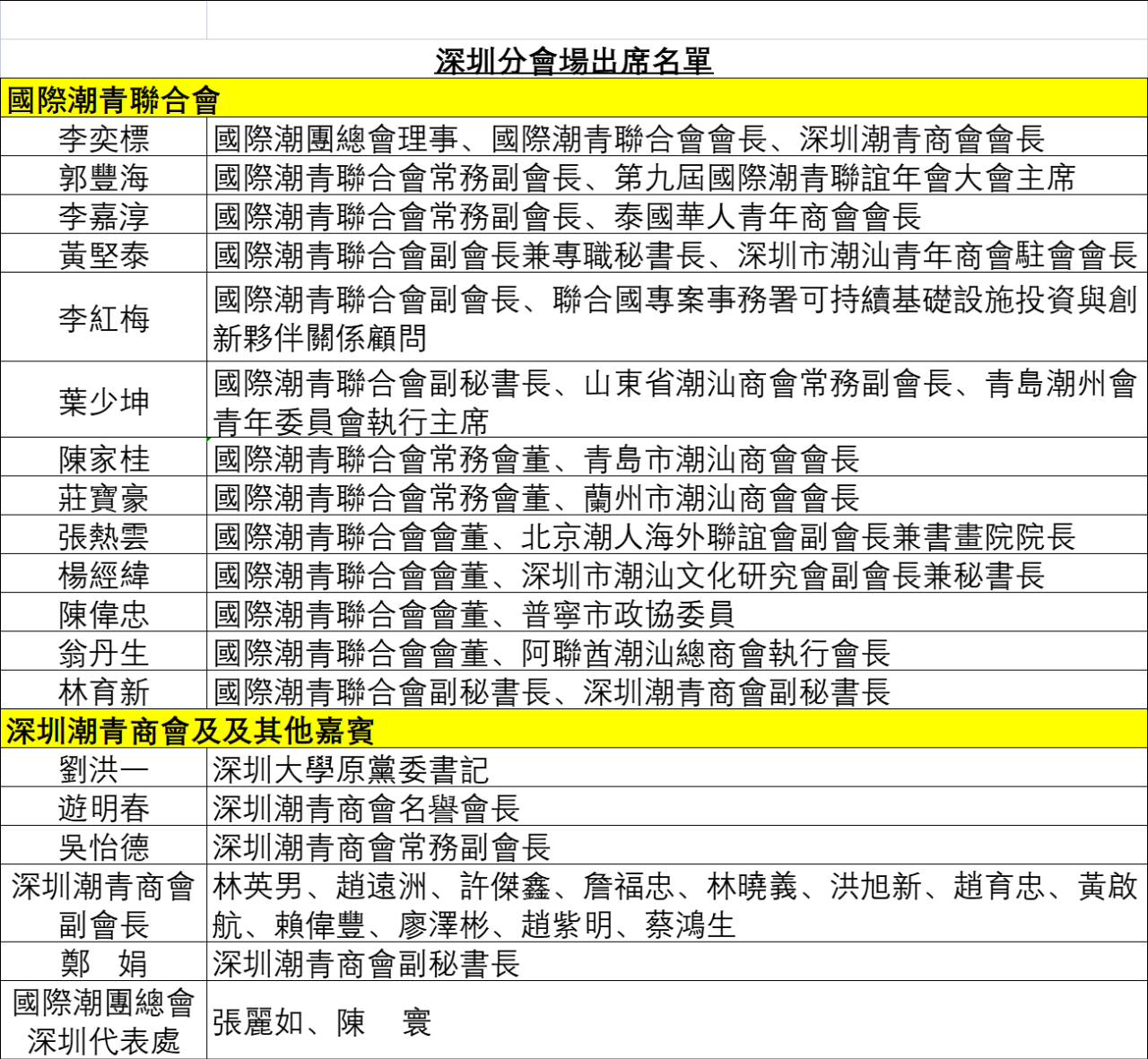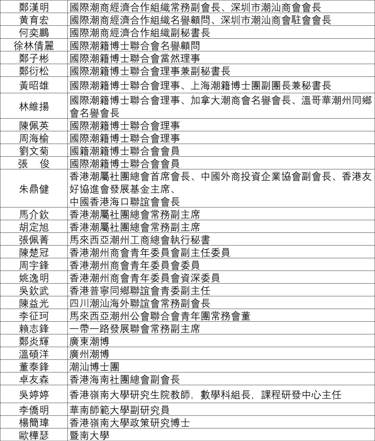 深圳大學黨委原書記劉洪一,國際潮團總會執行主席、國際潮青聯合會永遠會長陳幼南,國際潮青聯合會會長、深圳市潮汕青年商會會長李奕標,國際潮團總會永遠榮譽主席、中國僑聯副主席劉藝良,國際潮團總會永遠榮譽主席、湖北省潮人海外聯誼會會長陳少榮,國際潮團總會永遠榮譽主席、加拿大潮商會創會會長林少毅,國際潮團總會常務理事、馬來西亞潮州公會聯合會總會長黃賜興,國際潮團總會常務理事、新加坡潮州八邑會館會長曾建權,國際潮團總會個人常務理事、馬來西亞潮州工商總會總會長吳源盛,國際潮團總會理事、法國潮州會館候任會長文瑞潮,國際潮團總會理事、澳洲潮州同鄉會會長李國興,國際潮團總會理事、加拿大潮商會會長、溫哥華潮州同鄉會會長鄭煥明,國際潮青聯合會永遠會長、泰國中華總商會副主席暨各行業公會執行主任李桂雄,香港潮屬社團總會首席會長、全國政協委員朱鼎健,香港潮屬社團總會常務副主席馬介欽,香港潮屬社團總會常務副主席胡定旭等出席論壇(完整名單見滾輪)。陳幼南主席主持香港主會場,李奕標會長擔任線上主持人。聯合國項目事務署S31創新辦公室負責人JONAS發來祝賀視頻。