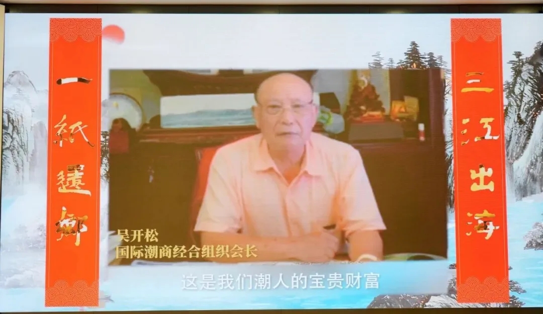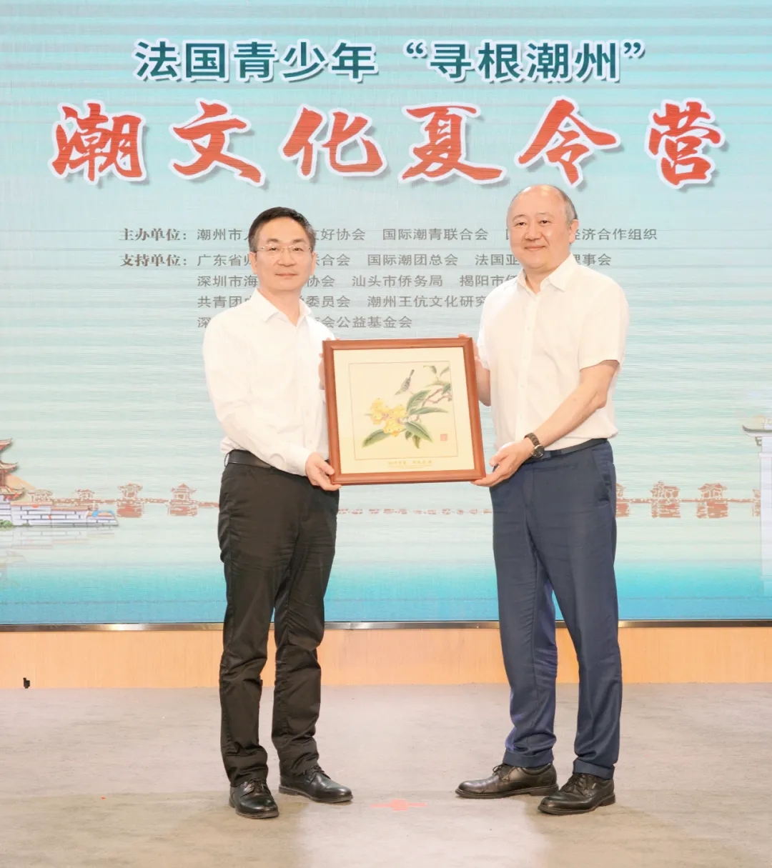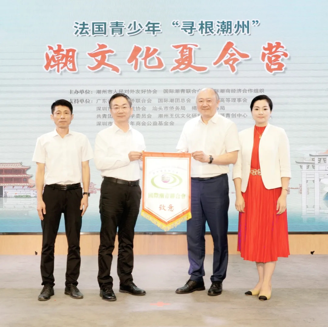 國際潮青聯合會代表陳文雄、李紅梅向潮州政府贈送紀念旗國際潮團總會執行主席、國際潮青聯合會永遠會長陳幼南,國際潮商經濟合作組織主席、國際潮青聯合會名譽會長吳開松通過線上方式祝賀「尋根之旅」夏令營活動隆重舉行。