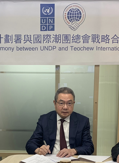 在各方的見證下,國際潮團總會主席洪江游、執行主席陳幼南博士代表國際潮團總會簽署了與聯合國開發計劃署的合作備忘錄。