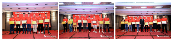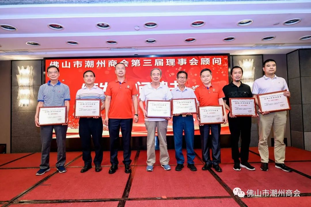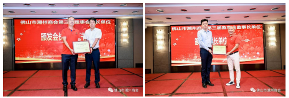 佛山市潮州商會第三屆理事會執行會長陳霖先生、陳漫霞女士、李青先生為第三屆理事會理事單位頒發證書