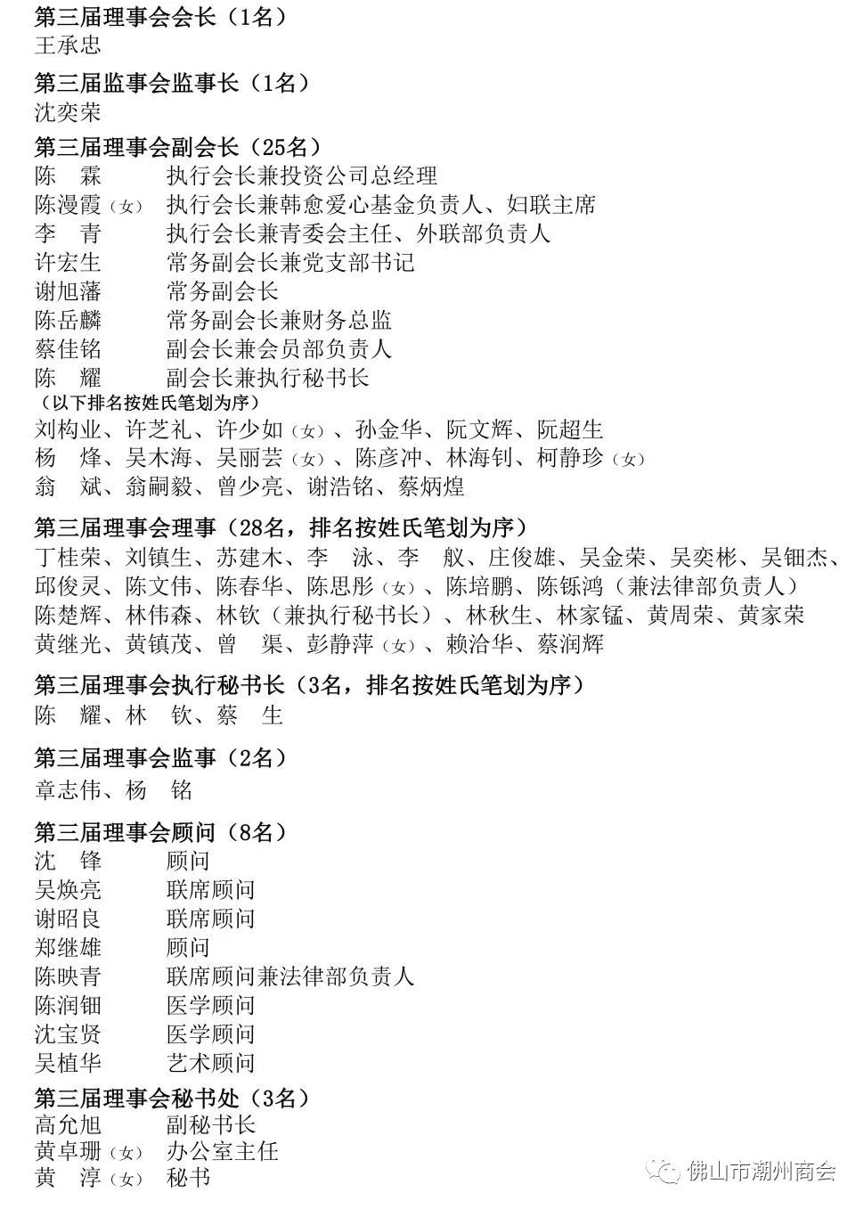 佛山市潮州商會第三屆理事會、監事會、顧問和秘書處名單