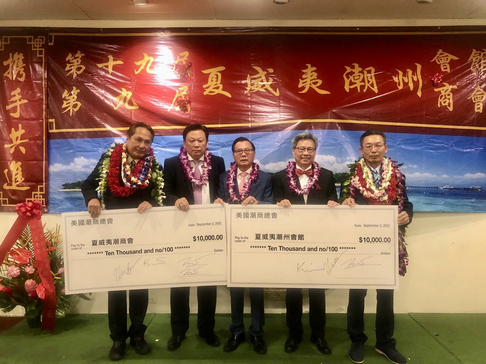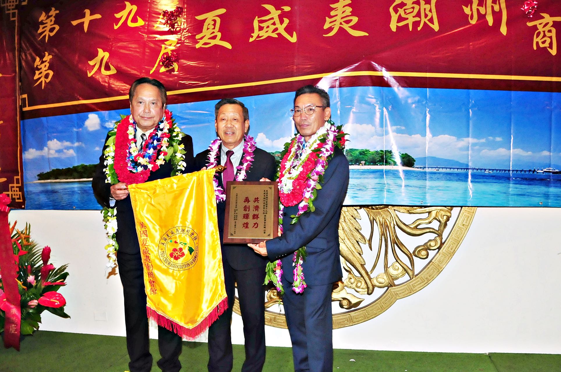 今次就職典禮,更喜獲美國潮商總會主席團主席林輝勇, 執行主席歐佳霖: 特別委託美國潮商總會屬下各執行主席--美西區翁漢豐主席、美東區李漢強主席、美南區孫偉根主席親臨指導並贈送給兩會兩萬元賀儀(潮州會館、潮州商會各一萬元),作爲推動會務基金,欣喜之餘,兩會會長謹代表兩會同仁向您們表達最衷心摯誠的感謝。