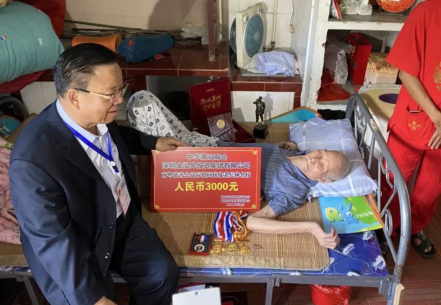 中華潮汕商會會長林樂文先生詳細詢問出席活動的老兵英雄們的身體狀況和生活情況,並送上慰問信和慰問金。