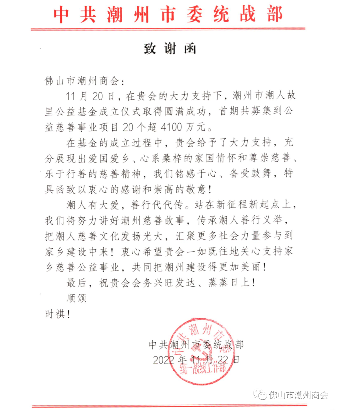 11月20日,潮州市潮人故里公益基金正式成立。這是潮州市充分發揮統一戰線在促進共同富裕和社會和諧中的獨特優勢,傳承潮人善行義舉,講好潮州慈善故事,讓慈善文化在海內外潮人中代代相傳的務實舉措。潮州市委書記何曉軍出席成立儀式。