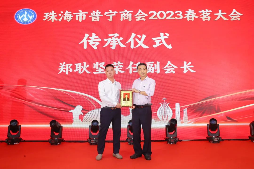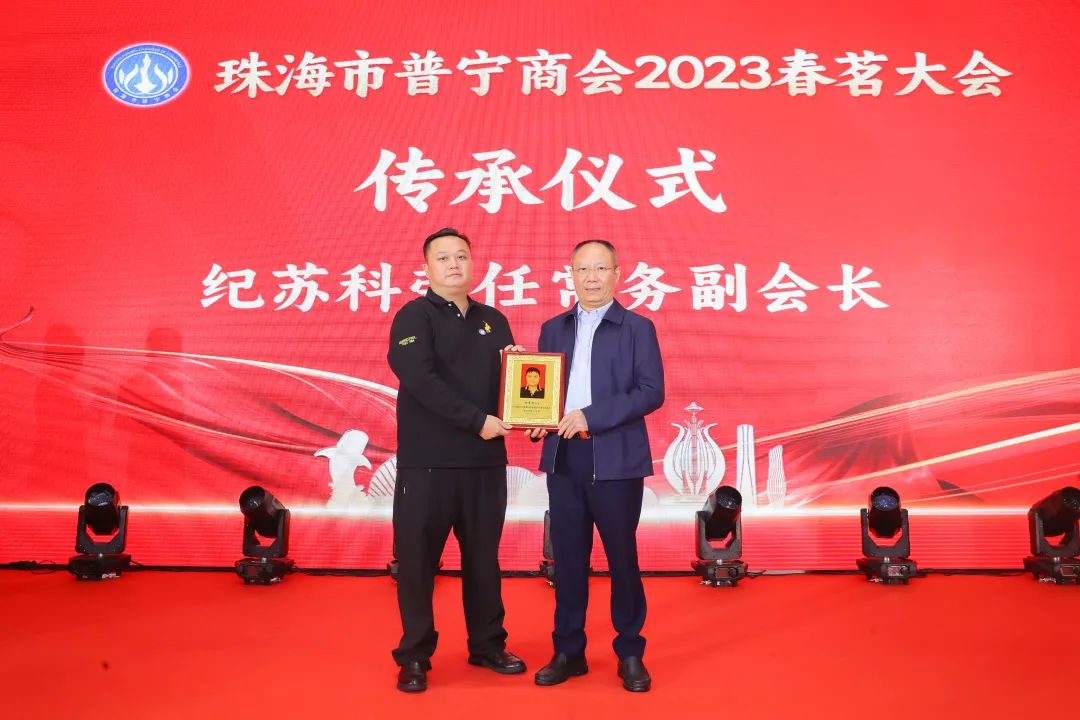 商會實施領導職務傳承制度,商會的常務副會長、副會長、常務理事、理事、會董等職務可傳承給下一代擔任,會長的傳承人自然成為商會常務副會長。為了激勵年輕一代普寧兒女積極傳承和發揚父輩優良傳統和精神,大會舉行了紀蘇科榮任商會常務副會長、鄭耿堅榮任商會副會長的傳承授牌儀式,蘇攢淘會長,張海松執行會長分別為他們頒發榮譽牌匾。
