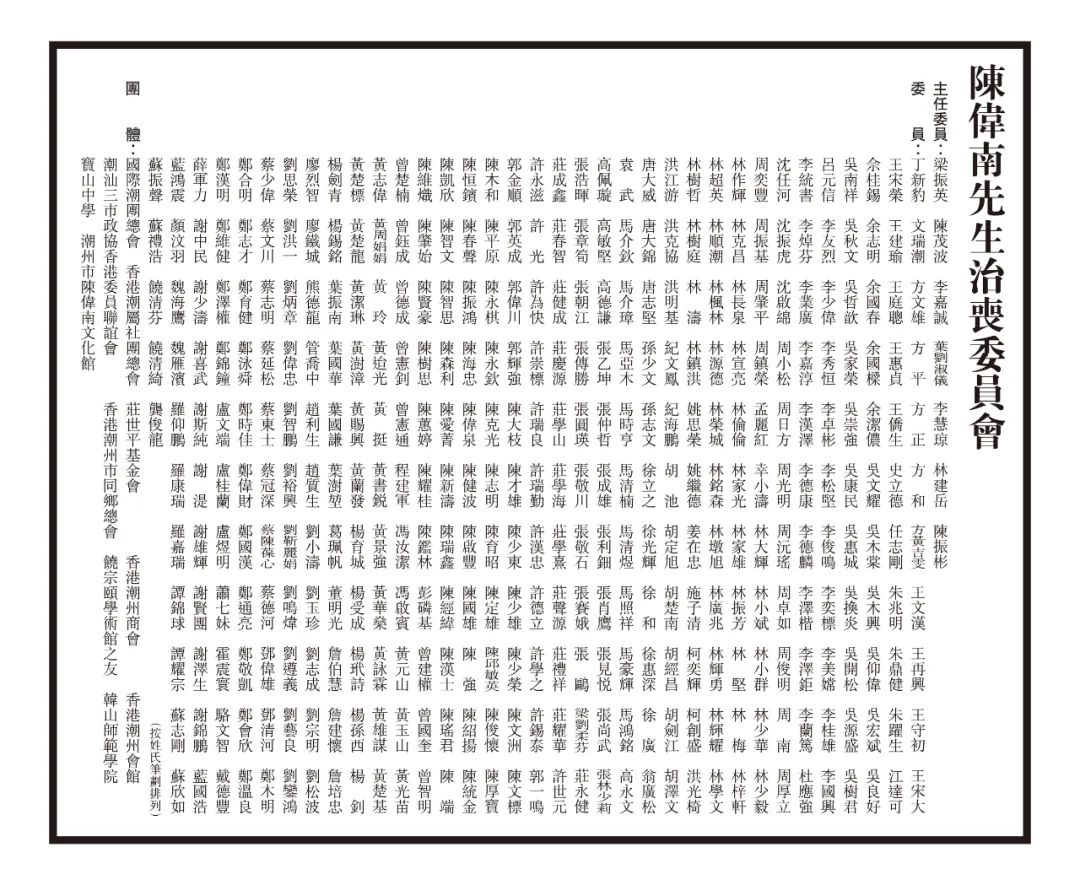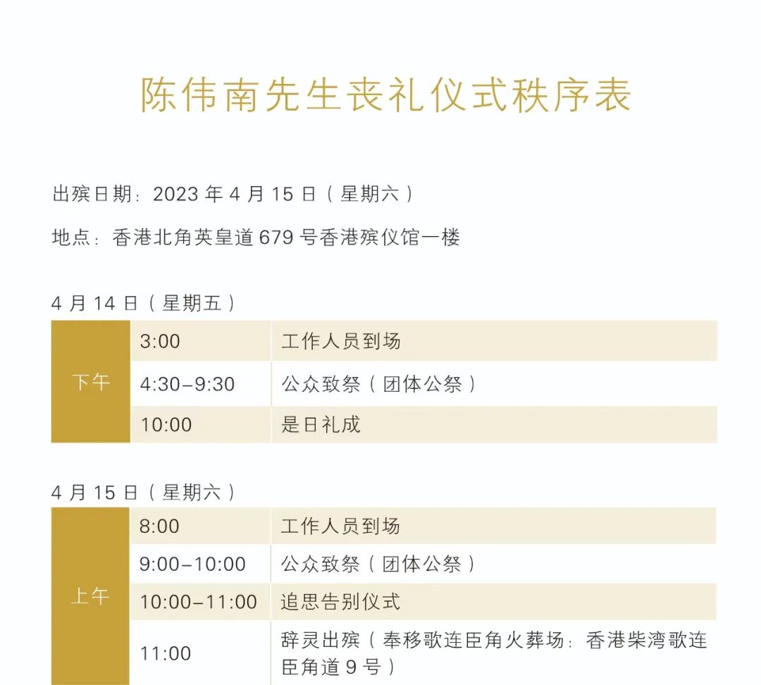 2023年4月15日上午,將在香港殯儀館一樓舉行陳偉南先生追思告別會。屆時潮州市將設立三個分會場,分別為潮州市陳偉南文化館、韓山師範學院中區偉南國際會議中心、寶山中學禮堂,各界人士可自行前往各會場參與追思、悼念。