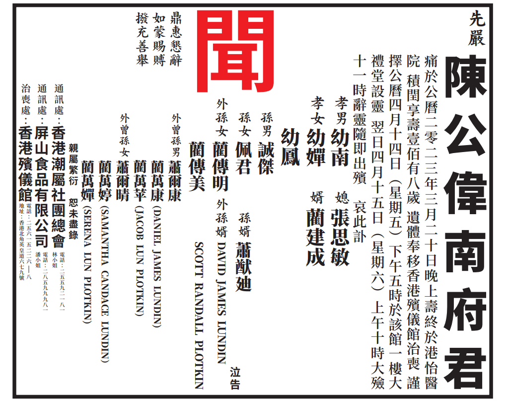 愛國僑領陳偉南先生於2023年3月20日傍晚在香港港怡醫院安詳逝世,積閏享壽108歲,遺體奉移香港殯儀館治喪。謹擇4月14日(星期五)下午5時於該館一樓大禮堂設靈。4月15日(星期六)上午10時大殮,11時辭靈出殯。