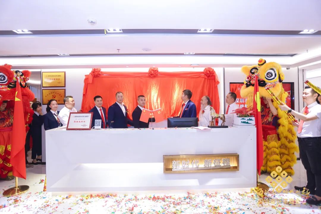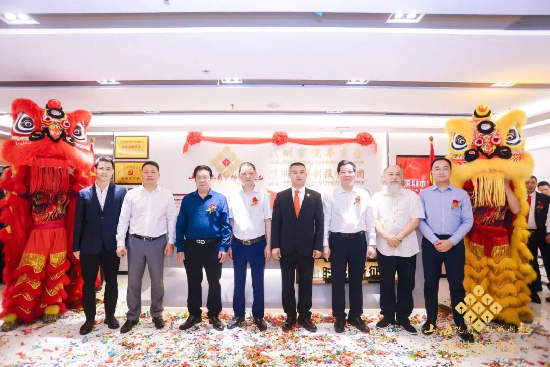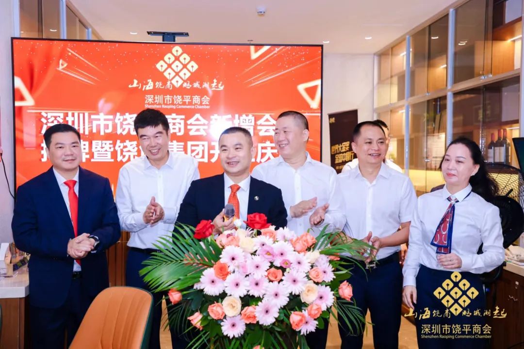 深圳市饒平商會永遠榮譽會長謝學源、永遠榮譽會長劉海景,會長詹表,執行會長謝考居、余喜文,監事長邱永遷,黨支部書記、常務副會長詹少傑,常務副會長兼秘書長張芳共同為深圳市饒平商會新增會址揭牌。