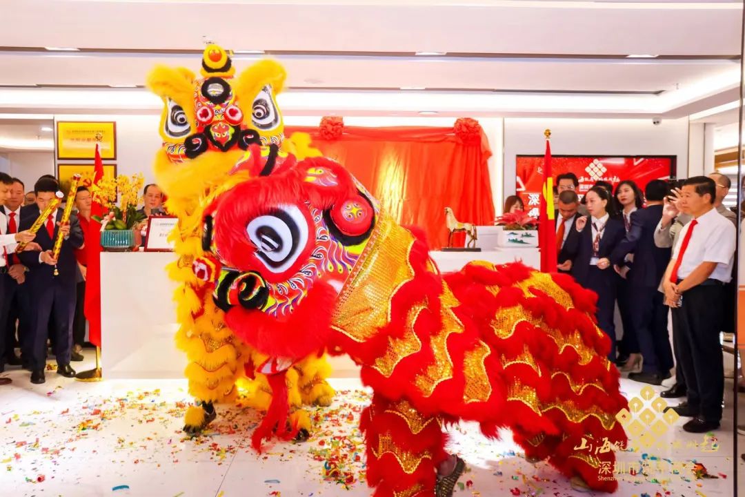 在鑼鼓喧天、禮炮齊鳴聲中,深圳市饒平商會會長詹表與執行會長謝考居共同以朱砂為祥獅點睛並共同接青、撒青,遍地生財。