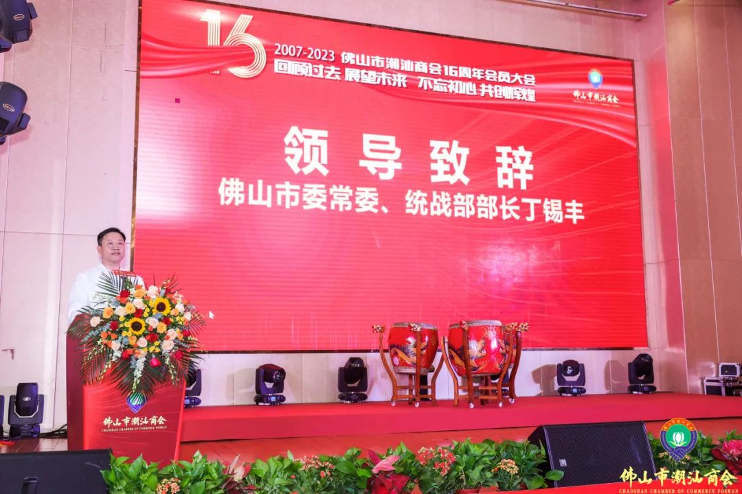 2023年7月1日,在熱烈慶祝中國共產黨成立102周年之際,佛山市潮汕商會迎來了「回顧過去,展望未來,不忘初心,共創輝煌」為主題的16周年會員大會!會議在佛山市禪城區福宴大酒店盛大舉行。佛山市市委、統戰部、民政局、社會組織管理局、工商聯等上級領導部門和各友好商協會、各潮屬社團等領導嘉賓和商會榮譽會長、名譽會長、顧問、理事會、監事會、會員代表等超過1000人出席本次大會。佛山市委常委、統戰部部長丁錫豐出席會議並講話鼓勵。