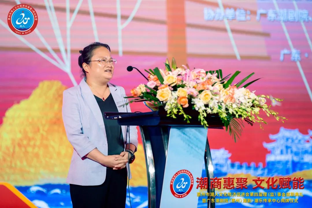 汕頭市委統戰部副部長、市工商聯黨組書記劉文華講話汕頭市委統戰部副部長、市工商聯黨組書記劉文華代表潮汕四市工商聯上臺致辭。她對長久以來懷揣滿腔熱情和拳拳愛鄉之心,不遺餘力為家鄉各項公益事業貢獻力量的廣大潮商表示衷心感謝,認為潮商如今更是汕頭高質量發展新征程上不可或缺的中堅力量;同時希望惠州潮人會積極發揮政府與企業之間的橋樑紐帶作用,積極傳播中華優秀文化與潮汕傳統文化,增強潮籍鄉親的文化自信和凝聚力。劉文華表示,2024年,汕頭將以最優的環境、最親的鄉音、最濃的鄉味,舉辦第二十二屆國際潮團聯誼年會、第十屆國際潮商大會。歡迎廣大鄉親們「回家」坐坐,一起喝杯工夫茶,看看潮劇,聽聽潮樂,攜手開啟潮商事業新篇章。