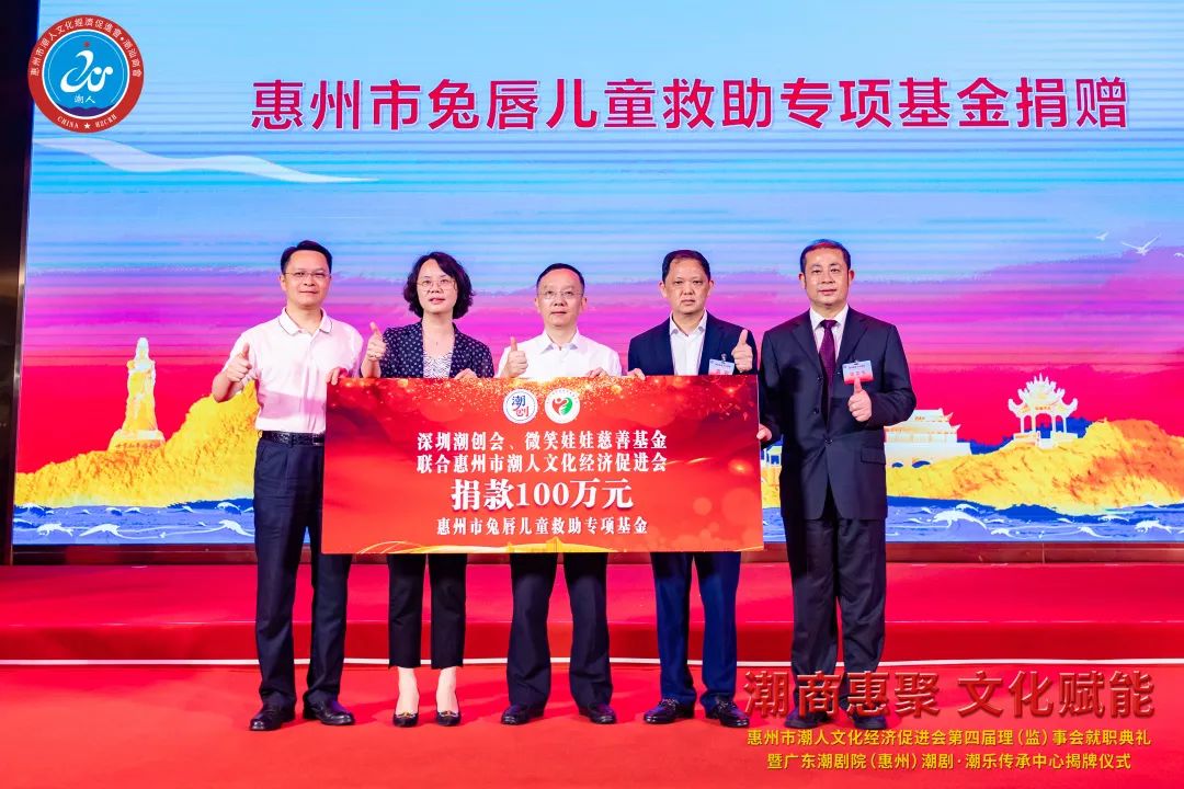 當日,廣東潮劇院(惠州)潮劇·潮樂傳承中心正式揭牌,標誌著潮汕傳統文化在惠州迎來了新的發展機遇,將成為傳承優秀傳統文化的前沿陣地。現場,通過視頻、展板等方式,對惠州市和潮汕四市營商環境進行了宣介;深圳潮創會、微笑娃娃慈善基金會會長、不得了集團董事長蔡文川聯合惠州市潮人文化經濟促進會長姚文專啟動惠州市兔唇兒童救助專項基金並捐贈100萬元,惠州市第一人民醫院、惠州市第三人民醫院代表上臺接受捐贈,中共惠州市委統戰部相關負責人上臺見證。
