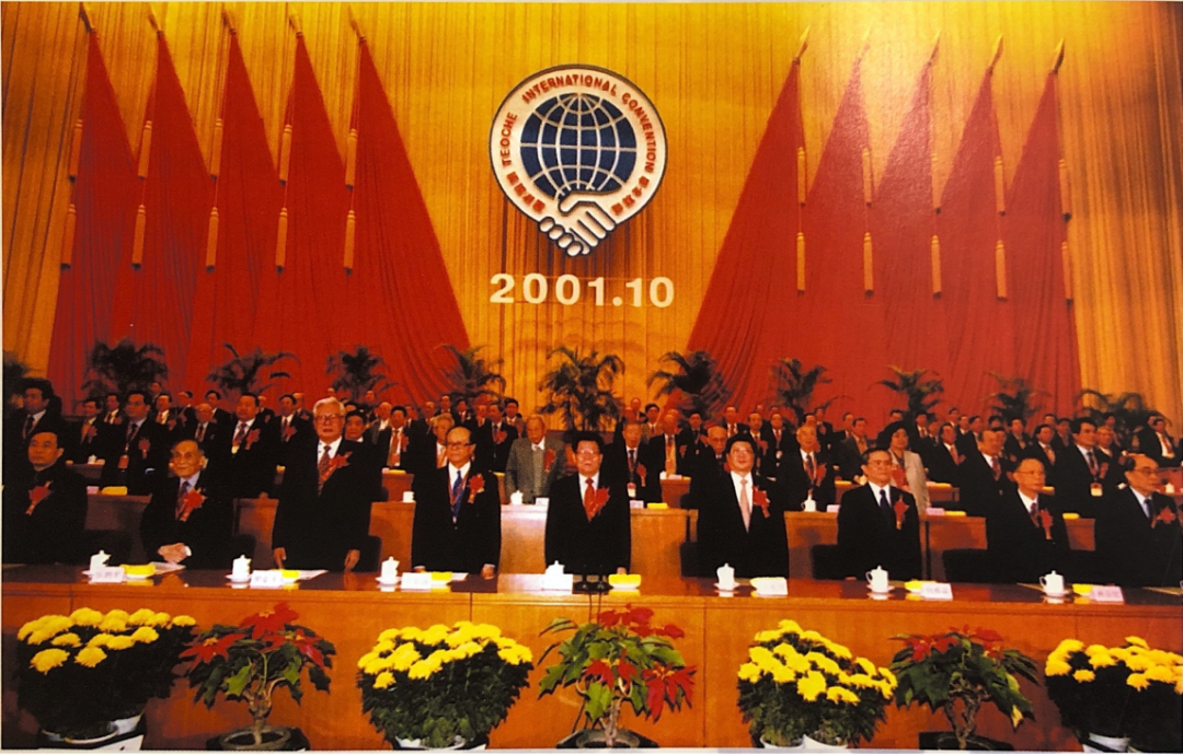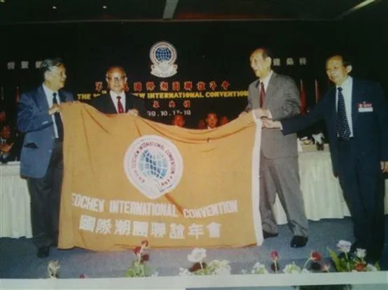 1999年10月17日至20日在泰國芭提雅召開第十屆國際潮團聯誼年會,北京潮人海外聯誼會成功申辦第十一屆國際潮團聯誼年會。會代表團團長馬慶雄(左2)、副團長陳端(左1)接收會旗,大會主席泰國潮州會館主席周鑑梅(右2)、副主席陳純(右1)授旗。