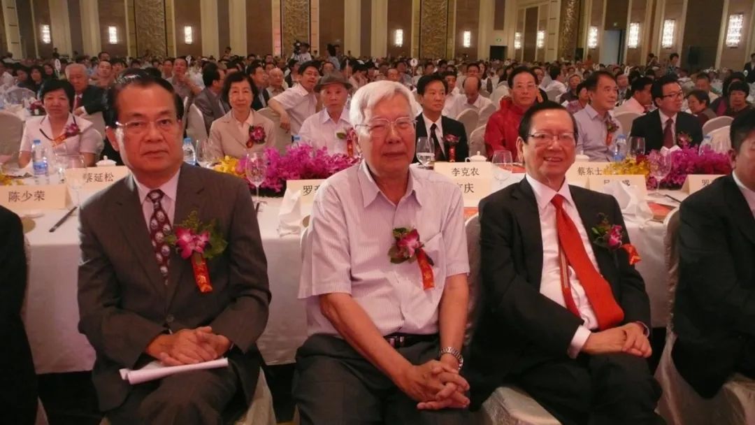 北京潮人海外聯誼會成立二十周年慶典大會上北京潮人海外聯誼會會長楊賢足(左)、全國政協原副主席羅豪才(中)、中國僑聯副主席、北京潮人海外聯誼會榮譽顧問陳有慶(右)