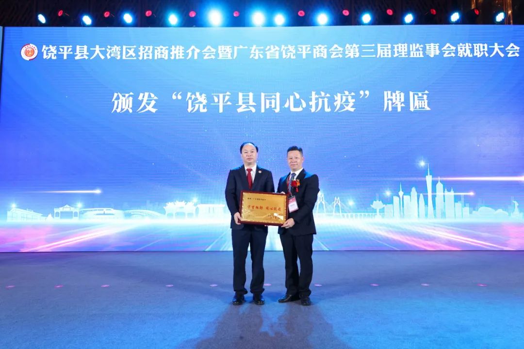 ▲饒平縣委副書記、縣長楊鎮榮為商會頒發「饒平縣同心抗疫」牌匾