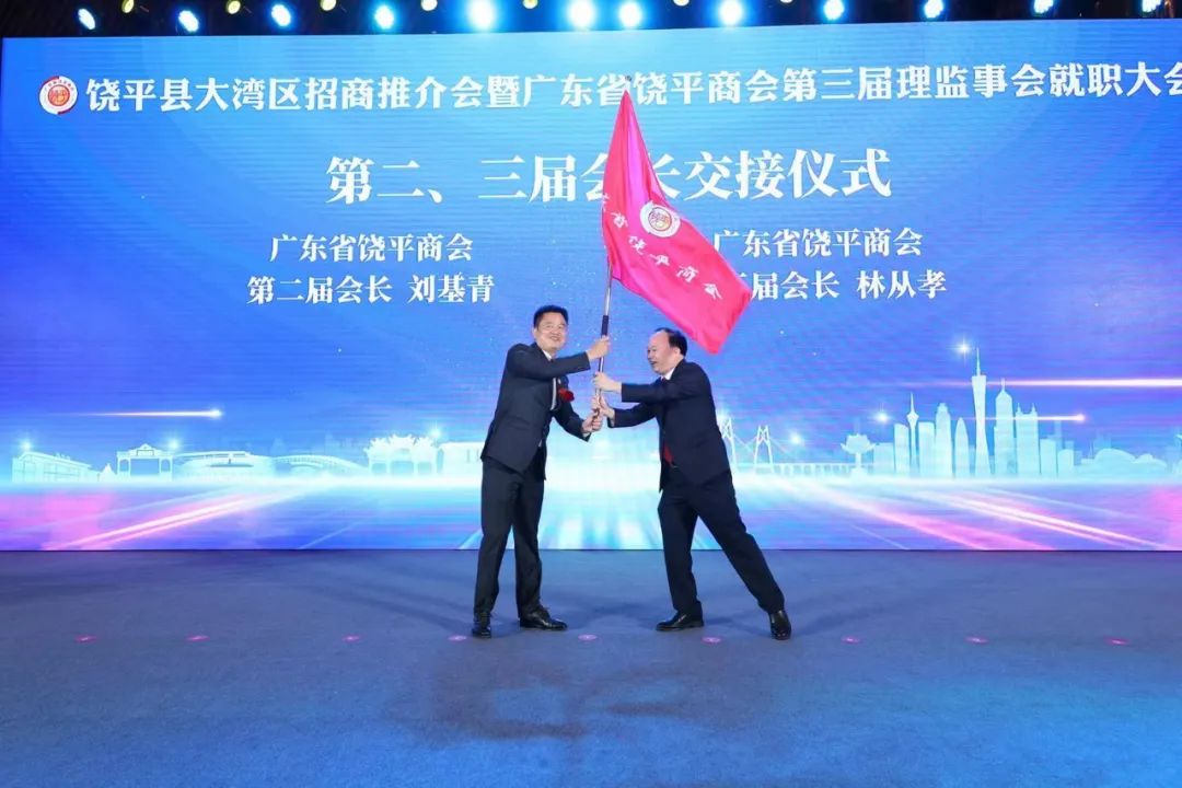 榮譽會長劉基青講話。他表示正式卸任長達十年的會長職位,把接力棒交到新一屆會長林從孝的手上。在擔任會長的十年裏,體會到了許多挑戰和收穫,儘管有些說不出的辛酸與苦辣,但更多的是快樂與幸福。同時有幸能夠擔任廣東省饒平商會第一、二屆的會長,有幸為商會大家庭工作的機會,要感謝創會會長劉嶸先生的傳承,要感謝商會全體同仁的團結與努力,要感謝商會顧問們的指導與幫助,要感謝歷屆縣委縣政府領導的關心與支持!他指出新一屆領導班子結構合理、總體素質高,特別是一批年富力強、實力雄厚、情懷濃郁的鄉賢加入領導機構,並對商會勇立潮頭再出發充滿信心。希望大家像支持他一樣支持新會長,依據辦會宗旨,努力創新辦會理念、拓寬服務方式、豐富服務內容,在新一屆會長林從孝的帶領下群策群力把商會辦得更好,譜寫新征程上的新篇章。