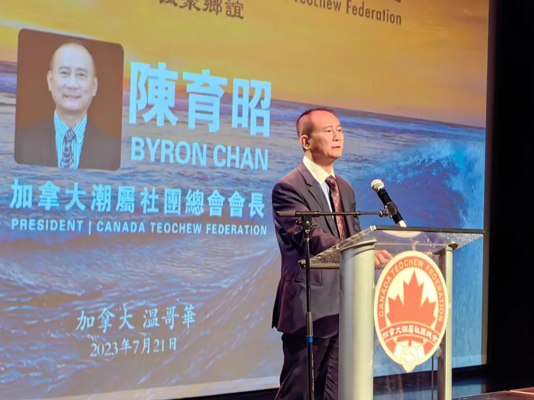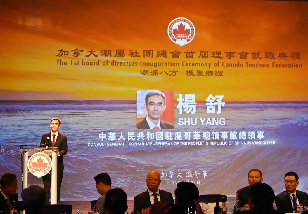 中國駐溫哥華總領事楊舒致辭,他代表中國駐溫哥華總領館,向陳育昭先生當選首任會長以及首屆理事會成立表示熱烈祝賀。楊總領事稱讚原溫哥華潮州同鄉會和加拿大潮商會是大溫地區具有影響力的重要華人社團,兩會自成立以來,秉承潮人文化傳統,積極發揚潮人精神,吃苦耐勞、拼搏進取,廣泛團結聯繫潮籍鄉親,關心祖(籍)國發展,為促進中加友好、深化各領域交流合作,弘揚中華優秀傳統文化,以及構建大溫地區和諧僑社做出積極貢獻。楊總領事希望新成立的加拿大潮屬社團總會在陳育昭會長的帶領下,在諸位潮籍鄉親的支持下,積極進取、拓展會務,在兩會的堅實基礎上,發揮一加一大於二的效應,進一步發揮橋樑紐帶作用,抓住新的發展機遇,再接再厲、再創輝煌。