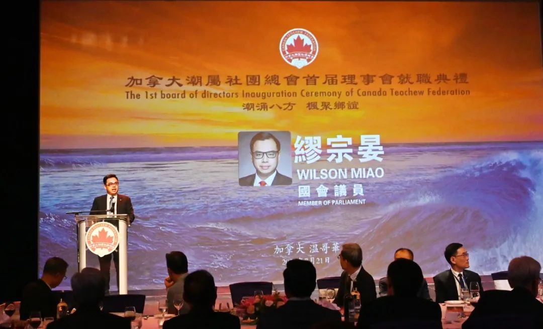 加拿大國會議員繆宗晏致詞,他代表聯邦政府祝賀加拿大潮屬社團總會成立並舉行第一屆理事會就職典禮,他感謝多年來潮籍鄉親們為加拿大的經濟文化建設、為華人社區的壯大發展、為慈善公益事業作出巨大貢獻。他表示,加拿大是一個多族裔、多元文化的國家,各族裔移民來自不同的原居國,大家一同融入加拿大,共同建設多元、包容、富強的國家。他希望新成立的加拿大潮屬社團總會帶領潮籍鄉親為經濟發展、社區和諧繼續努力。