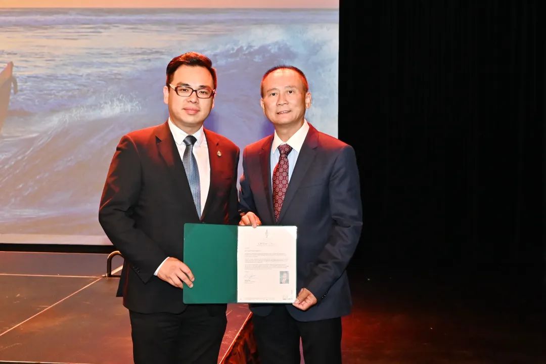 卑詩省議員李耀華代表BC聯合黨祝賀加拿大潮屬社團總會理事會隆重就職,他代表聯合黨向加拿大潮屬社團總會頒發感謝狀。