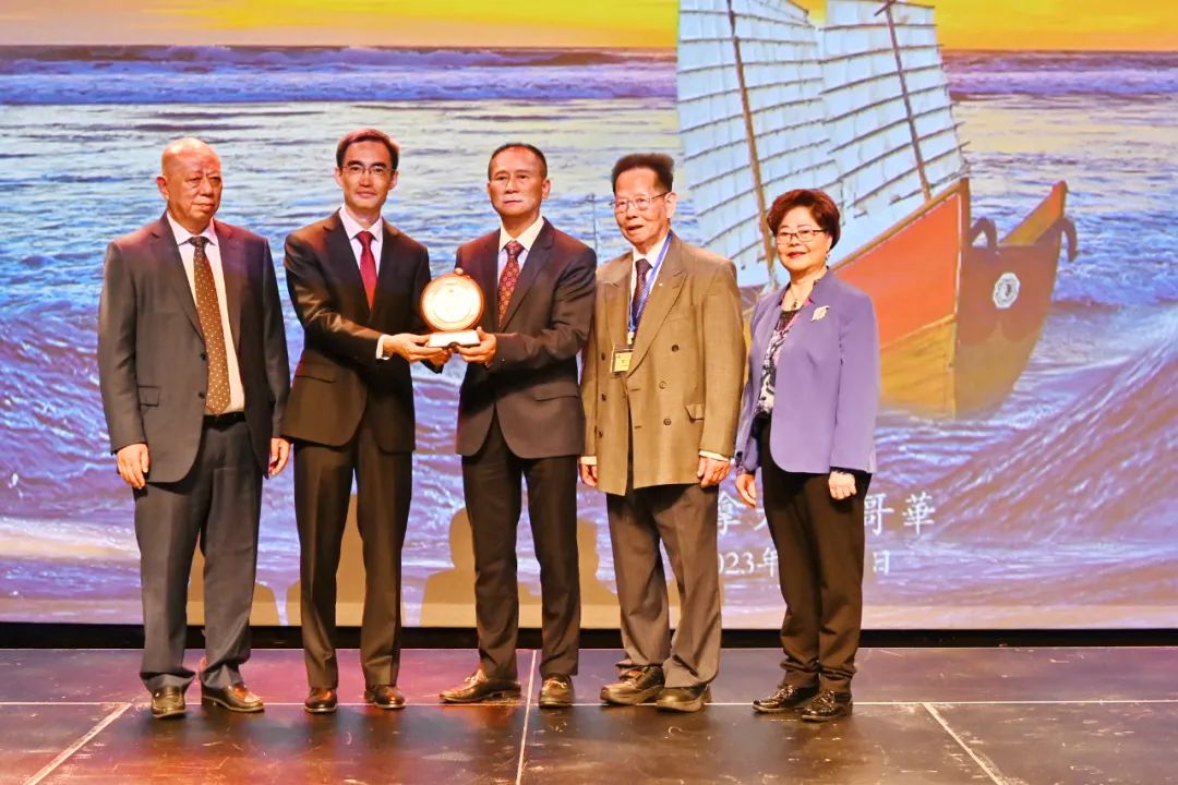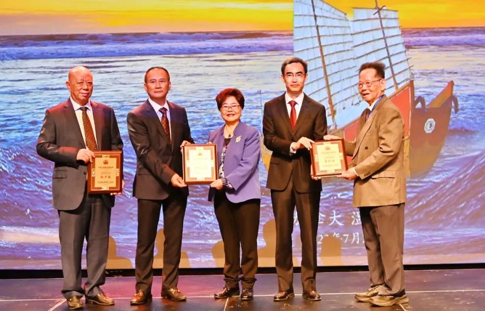 加拿大潮屬社團總會陳育昭會長、中華人民共和國駐溫哥華總領事楊舒,一起為永遠榮譽會長林少毅、黃陳小萍、蔡仁初授牌