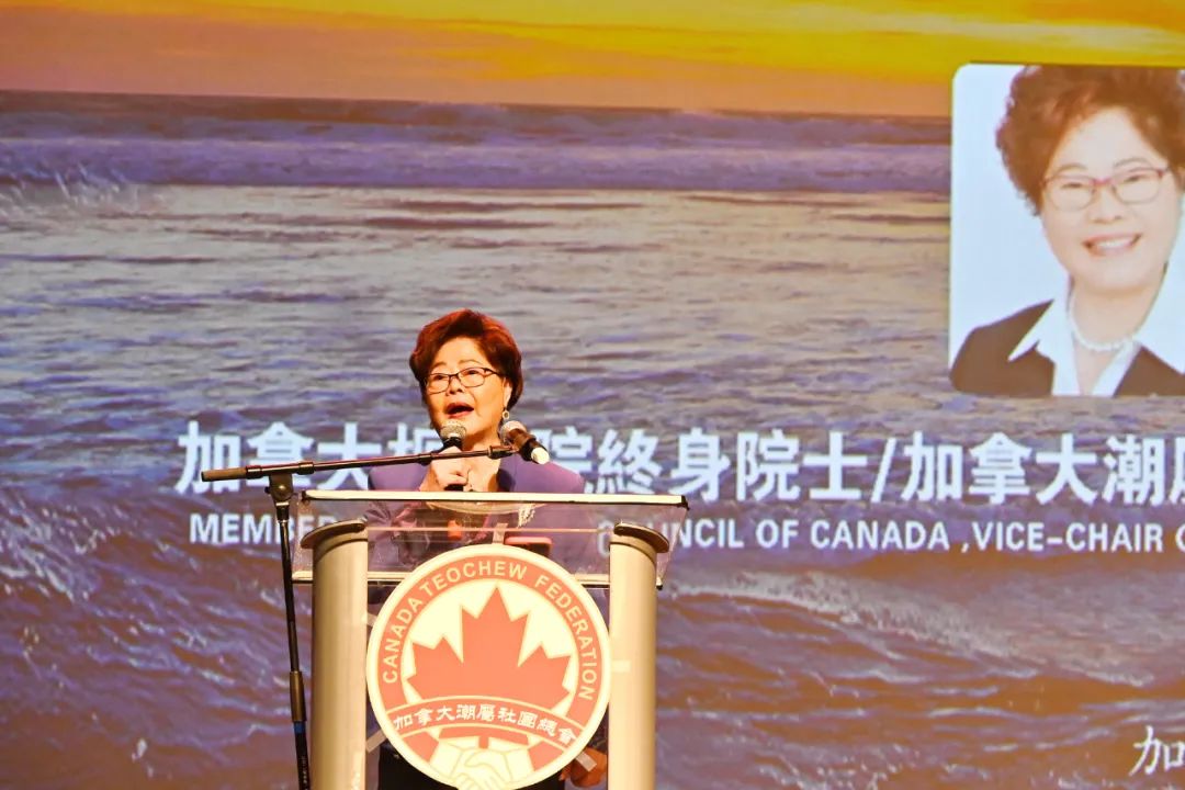 加拿大樞密院終身院士、加拿大潮屬社團總會會董會副主席、永遠榮譽會長黃陳小萍致辭;加拿大潮屬社團總會共同會長蔡光致感謝辭