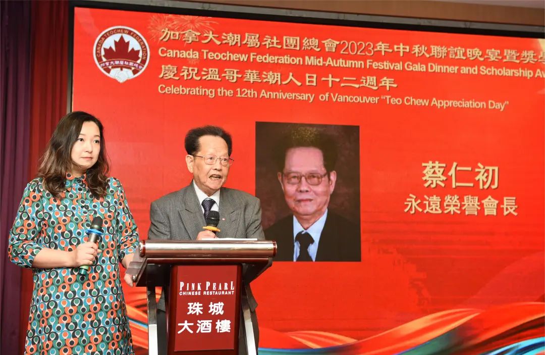 永遠榮譽會長蔡仁初先生致辭,他大讚「總會鄉賢多才俊,攜手團結展雄風」!在陳育昭會長帶領下,近日即將完成購置新會所壯舉。總會領導及鄉親們團結一致,群策群力、眾志成城;從呼籲籌款至籌足資金、全部捐款到賬只用了20天時間;陳育昭會長更是帶頭表率捐款30萬加幣。蔡老會長指出9月10日恰逢「潮人日」十二週年,今天舉辦潮屬社團總會首屆中秋聯誼暨獎學金頒獎典禮,意義重大。潮人日是溫哥華政府對潮人貢獻的肯定,極大增強了潮人的社會地位,希望年輕學子繼承祖輩們的拼搏向上精神,勤學奮進,勇往直前!