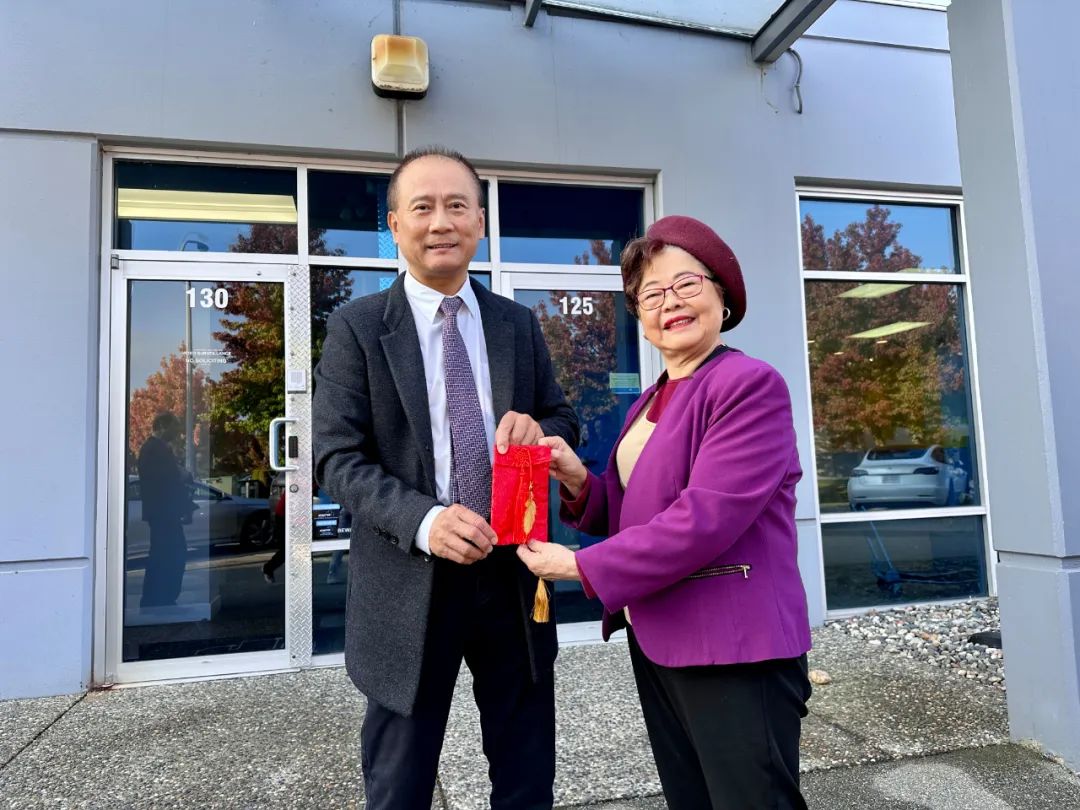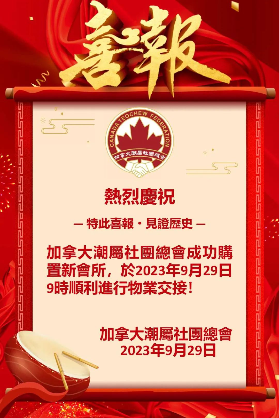 2023年9月29日,加拿大潮屬社團總會順利進行位於125-11300 No.5 Road, Richmond的新會所物業交接,標誌著新會所購置圓滿成功!上午9時,會長陳育昭和會董會副主席、永遠榮譽會長黃陳小萍打開新會所大門,率領加拿大潮屬社團總會領導團隊代表進入新會所,慶祝新會所交吉圓滿成功!