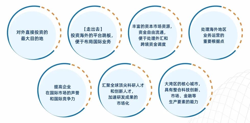2022年,以中國內地為母公司的香港企業有2,114家,其中有578家以香港作為地區總部或辦事處。截止2022年底,在港交所上市的內地企業有1,409家,佔上市公司總數的54%,總市值約27.4萬億港元,佔整體總市值的77%,香港是內地企業海外融資的首選平臺和粵港澳大灣區的重要功能平臺。
