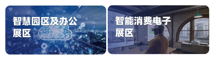 智慧園區及辦公展區:智慧樓宇、智慧辦公軟硬體及解決方案、智能網聯、智慧交通、智慧生產系統等;