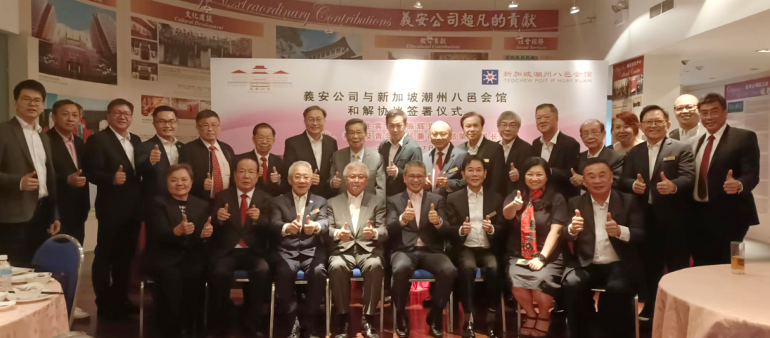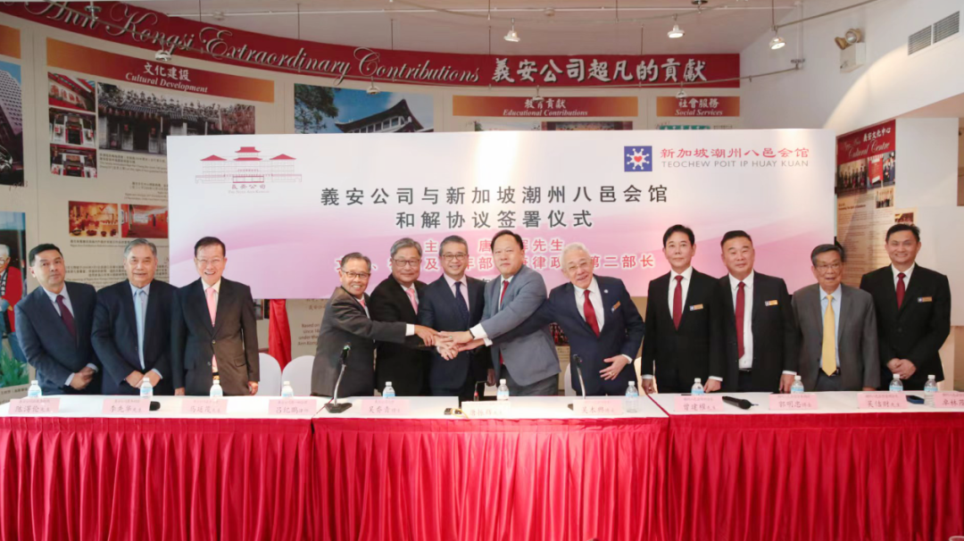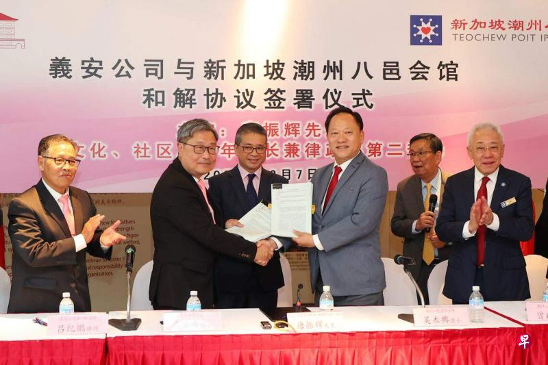 在負責華社事務的文化、社區及青年部長兼律政部第二部長唐振輝見證下,新加坡兩個最大的潮州團體義安公司和潮州八邑會館於12月7日在登路(Tank Road)97號潮州大廈簽署協議,但協議規定雙方不得對外公布和解細節和條款。和解協議由潮州八邑和義安公司各派出多名代表簽署。宗鄉會館聯合總會會長蔡其生和中華總商會會長高泉慶等人受邀出席觀禮。