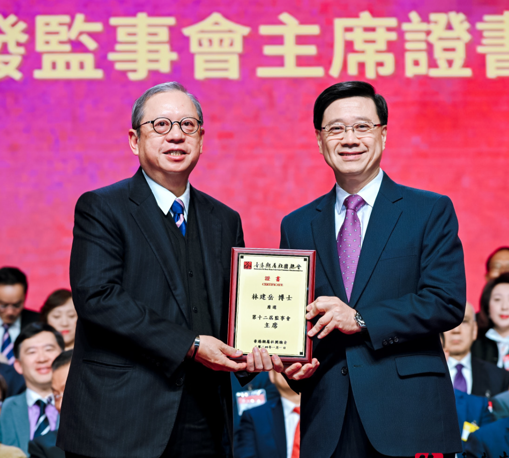行政長官李家超(右)向林建岳頒發監事會主席(左)證書