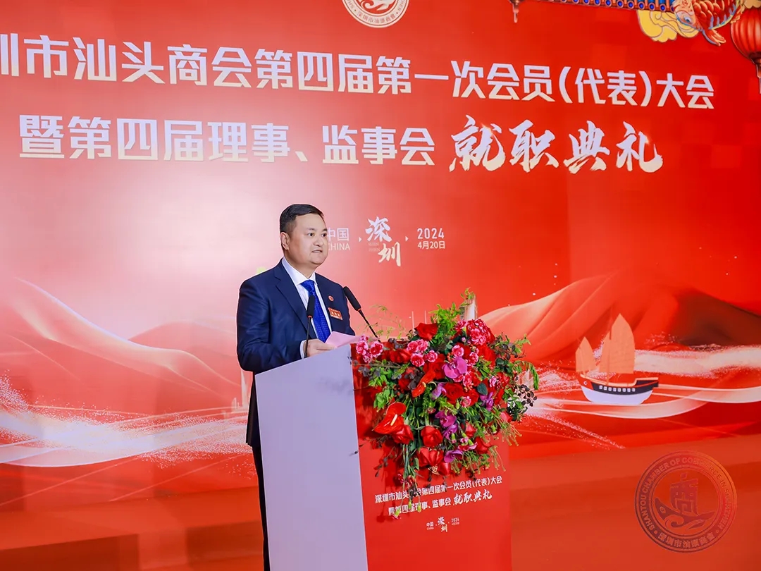 今天,我們在這裏隆重舉行深圳市汕頭商會第四屆理事、監事會就職典禮,這是一個令人振奮的時刻,也是我們共同邁向未來的新起點。借此機會,向長期以來支持和關心汕頭商會發展的各級領導、社會各界朋友表示衷心的感謝。深圳市汕頭商會自鄭基明會長、陳明勤監事長接任以來,在促進經貿交流、加強會員服務、推動社會公益等方面取得了顯著成績,成為連接深圳與汕頭兩地經濟合作的重要橋樑和紐帶,為粵港澳大灣區建設發揮著積極作用。站在新的歷史起點上,面對新時代的新要求,深圳市汕頭商會將面臨更多挑戰和機遇,需要不斷創新工作思路,拓展服務領域,增強商會的凝聚力和影響力。在此,我呼籲商會各位同仁,讓我們以更加飽滿的熱情和堅定的信念,一如既往的支持汕頭商會的工作,積極參與商會的活動,共同開創汕頭商會工作的新局面,為奮進百年商會目標貢獻力量。最後,祝願在座的領導、嘉賓、朋友們事業蒸蒸日上,家庭幸福美滿!