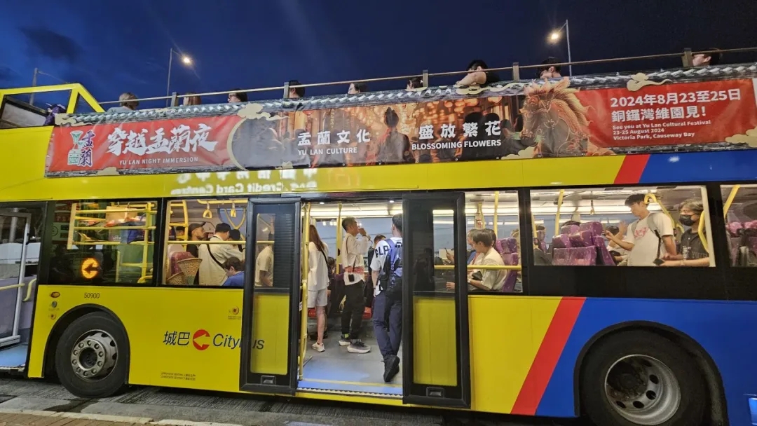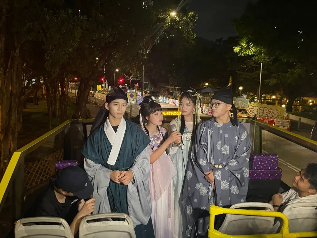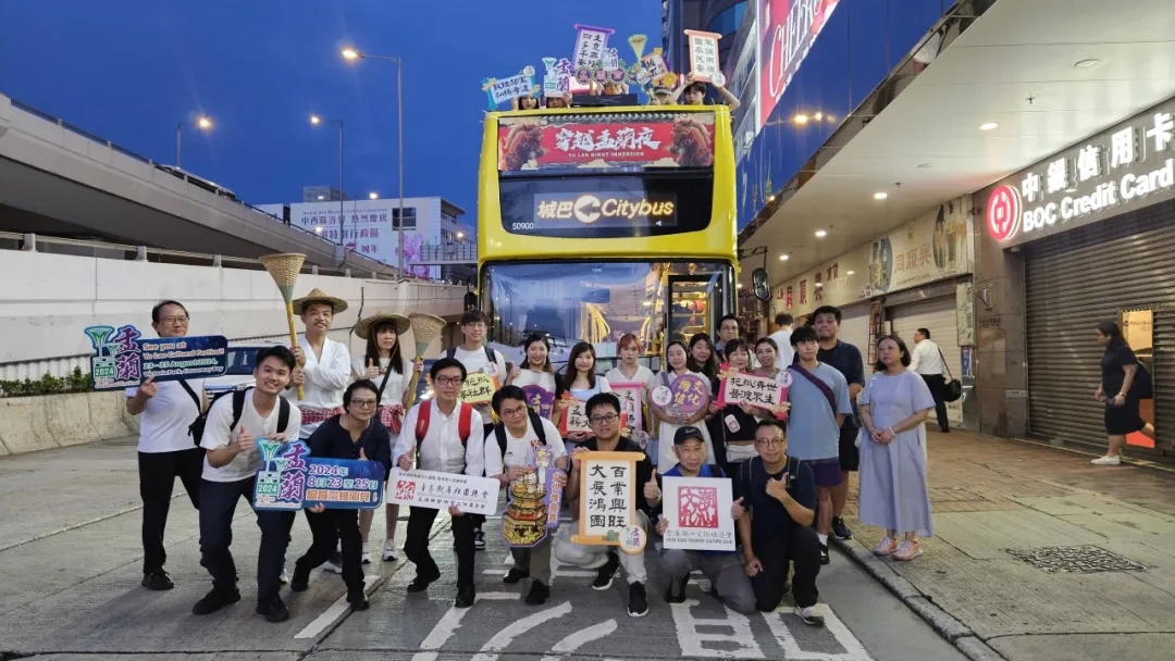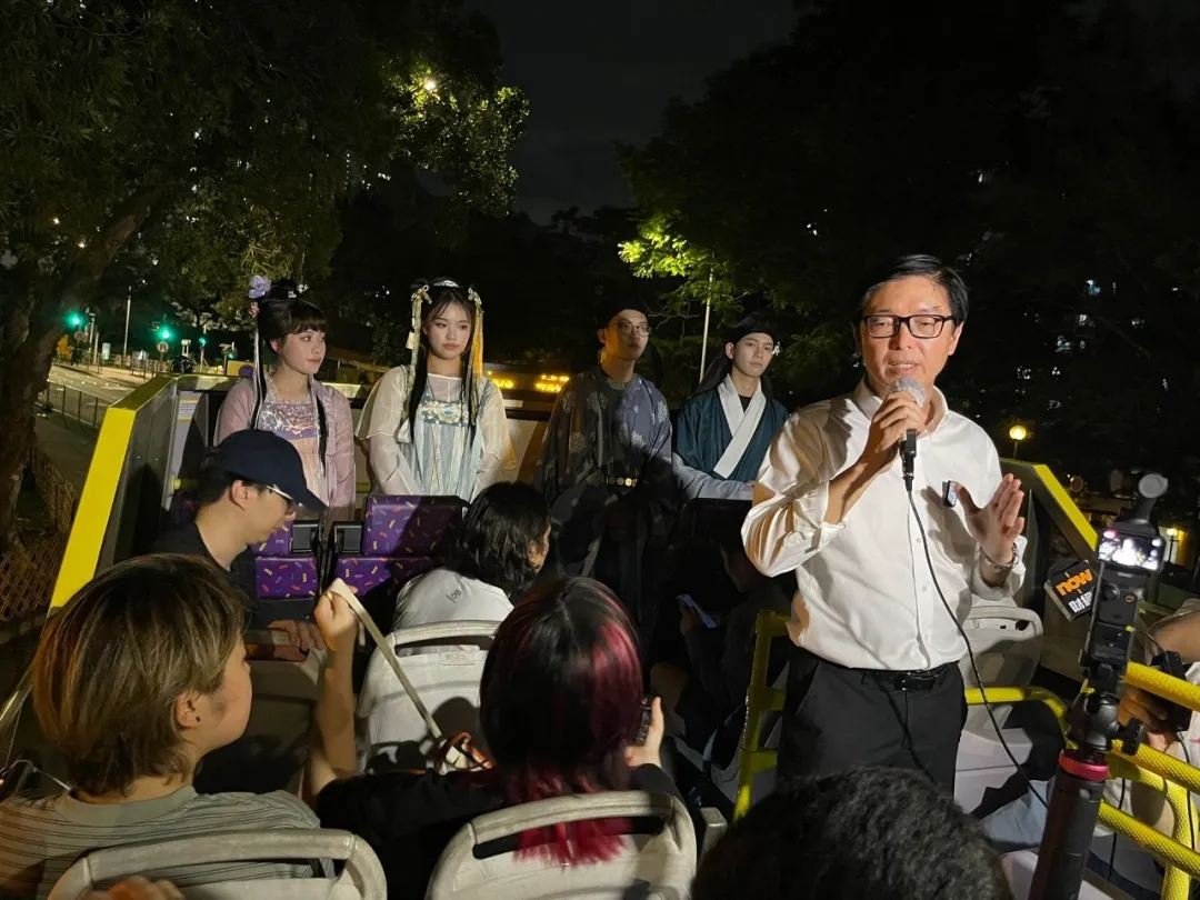 在巴士上由香港潮屬社團總會盂蘭勝會保育工作委員會胡炎松主席分享盂蘭文化知識及由大學生演繹的天神與參與者玩盂蘭推理遊戲,體驗穿越盂蘭夜。