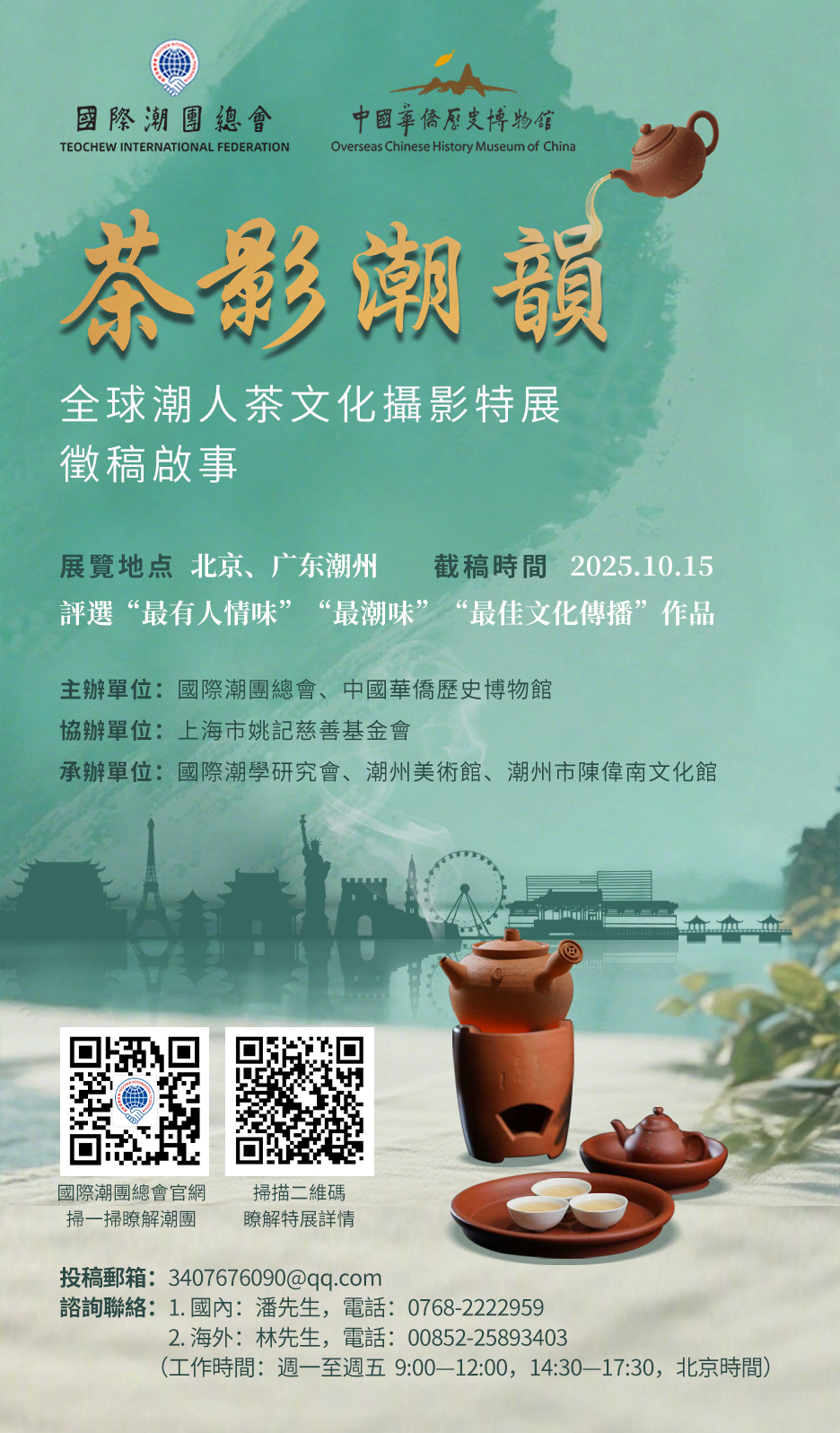 為弘揚中華優秀傳統文化,以茶為媒聯結全球潮人鄉誼,記錄潮州工夫茶海外傳播的印記與潮人海外奮鬥的足跡,展現中外文化交流互鑒的豐碩成果,值第 23 屆國際潮團聯誼年會在潮州舉辦之際,擬在潮州、北京兩地舉辦“茶影潮韻——全球潮人茶文化攝影特展”。本次特展以潮州茶為情感紐帶,串聯全球潮人情感,彰顯潮人精神與文化底蘊,以影像傳遞“茶和天下、美美與共”的人文理念。現特向全球攝影工作者、攝影愛好者、潮籍鄉親及相關商會、企業誠摯徵集優秀作品。