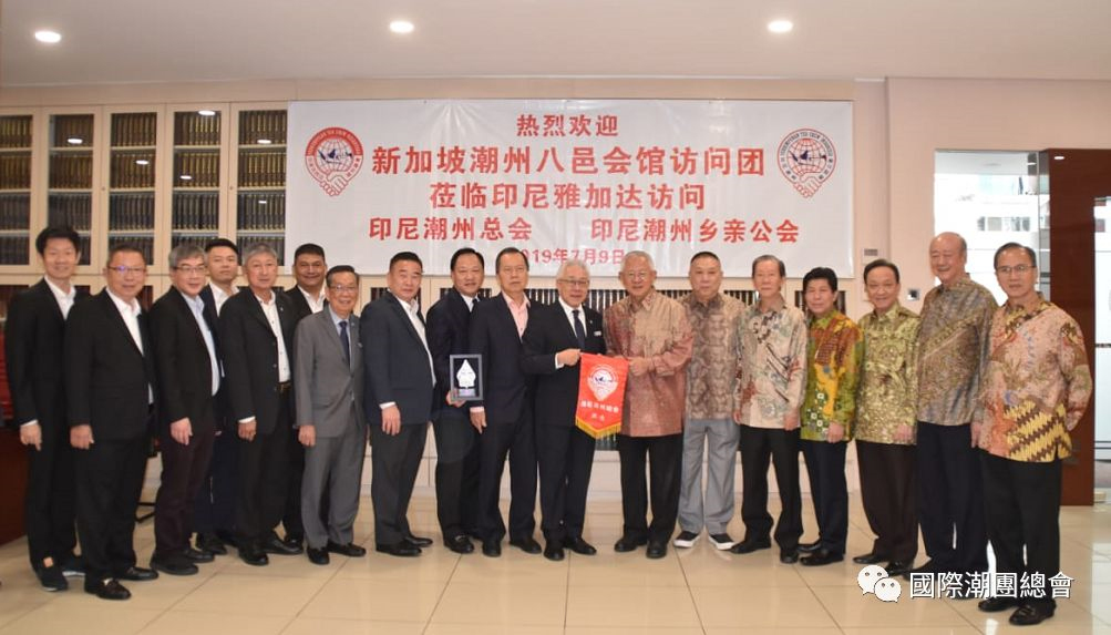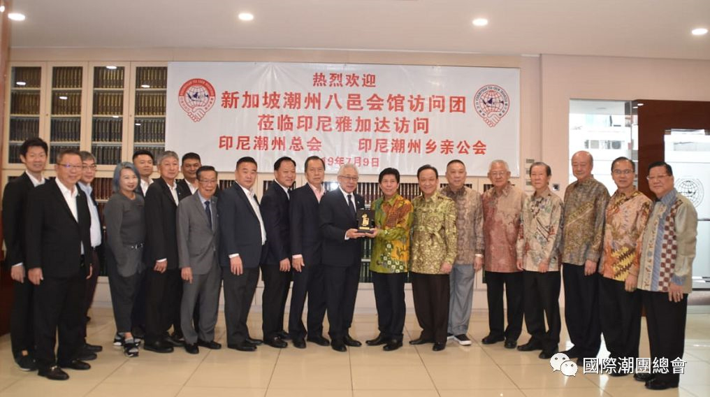 2019年7月9日(星期二)上午10時,印尼潮州總會會長曾國奎,監事長蔡明盛,秘書長周沅瑤、永久名譽主席楊金鋒、紀逢貞、理事會副會長蔡裕資、連介豪、羅志忠、董事會副主席鄒南炳、盧勤勝、名譽主席吳石豹、印尼潮州鄉親公會會長黃財利、總務林政凱等理事、在雅加達西區Rukan Sentra Latumenten Blok C/12的會所、熱烈歡迎新加坡潮州八邑會館會長曾建權率領一行代表團16人包括永遠名譽會長吳南祥、蔡紀典、署理事長拿督斯裡吳木興博士、副會長吳佶財、名譽會長黃偉忠、總務卓林茂、副總務郭緒澤、青年團署理團長黃亮、文教部副主任辜玠椿、董事林錦泉等理事。雙方就對兩地的文化領域的發展互相交換信息、團結鄉親、加強友誼。