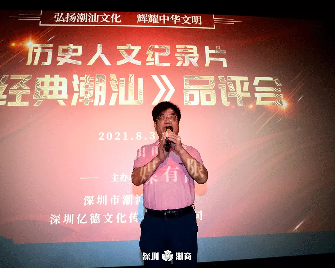 鄭漢明會長在致辭中表示,由深圳潮籍企業“億德文化”策劃並投資出品的《經典潮汕》,是一部全面介紹潮汕歷史人文紀實片,這一紀錄片的順利拍攝,是潮汕文化建設領域的一大盛事,對於研究和弘揚潮汕文化也具有重要的現實意義和作用。我們要依托潮汕文化這一珍貴資源,講好潮汕故事,豐富文化內涵,增強文化自信,提升競爭軟實力。