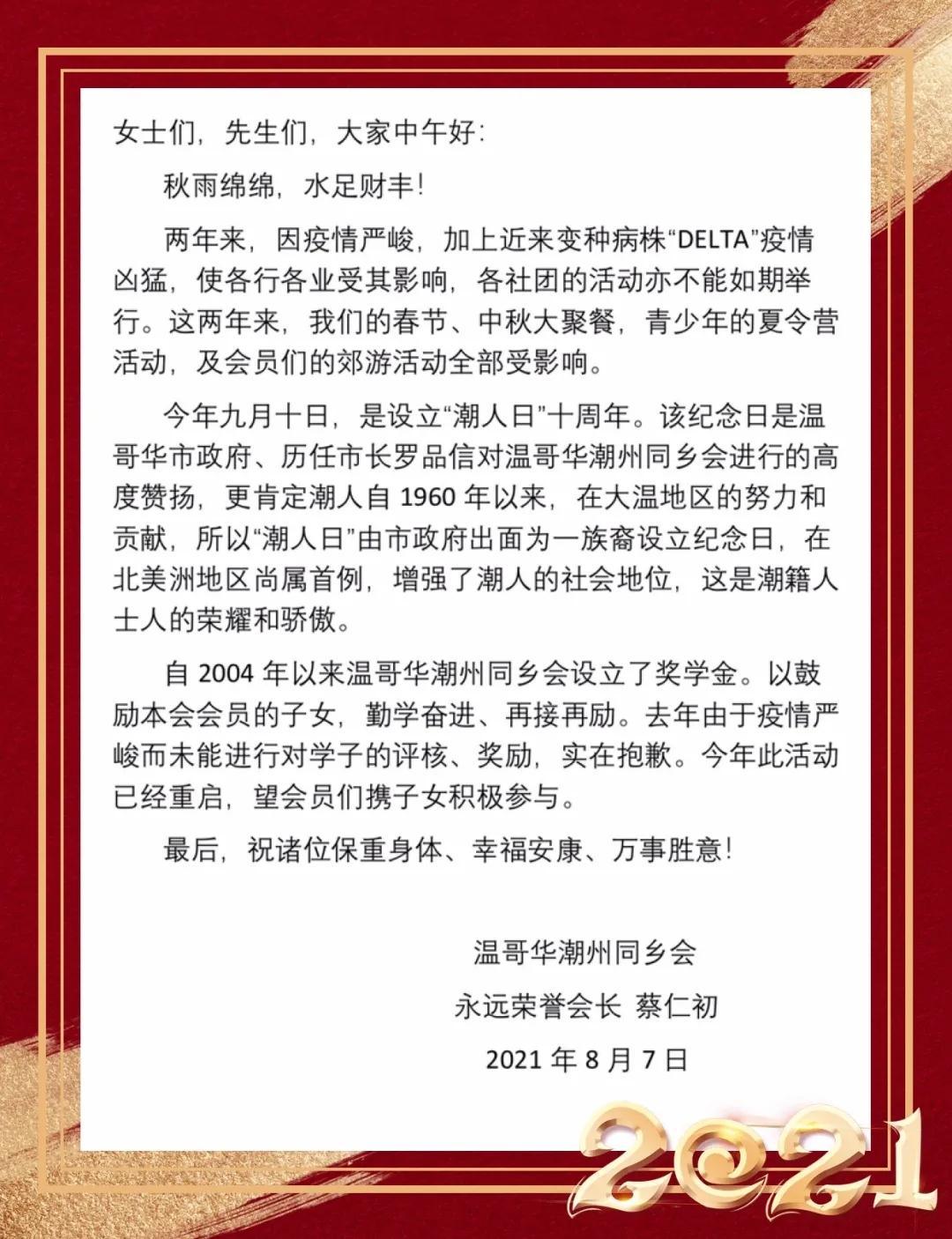 目前全球新冠肺炎疫情依然嚴重。據悉,受疫情影響社團各種節日相聚或活動都被迫取消,當日相聚的鄉親已接種了疫苗覺得有一定的保障,又因許久沒見,故借立秋之時相聚,久別重逢,格外歡喜。