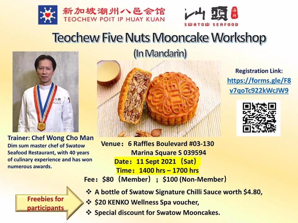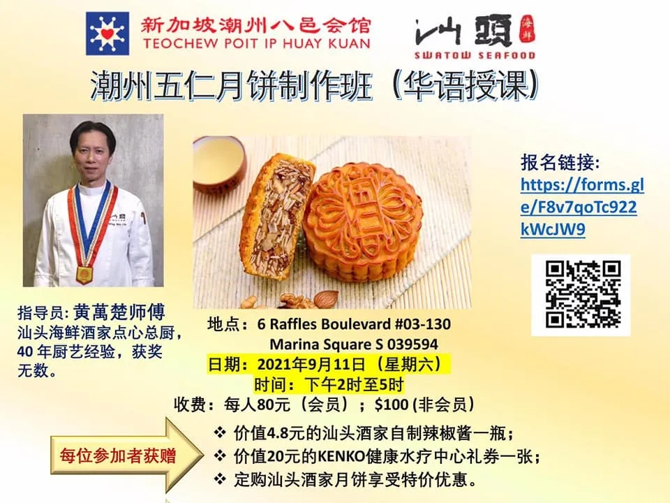 臨近的中秋佳節,國際潮團總會會員新加坡潮州八邑會館攜手Swatow Seafood Restaurant 汕頭海鮮酒家 將於 2021 年 9 月11日下午2時至5時 與黃萬楚主廚開辦潮州五仁月餅製作班,快來加入度過一個愉快的周末下午吧!
