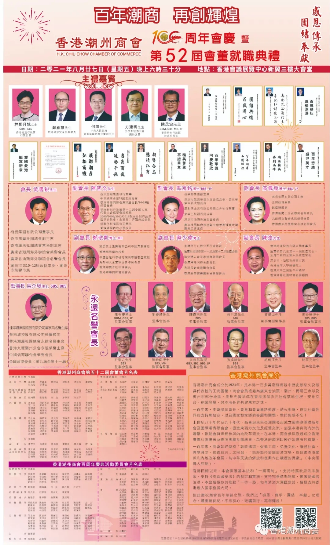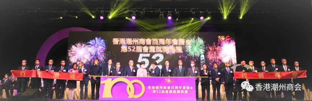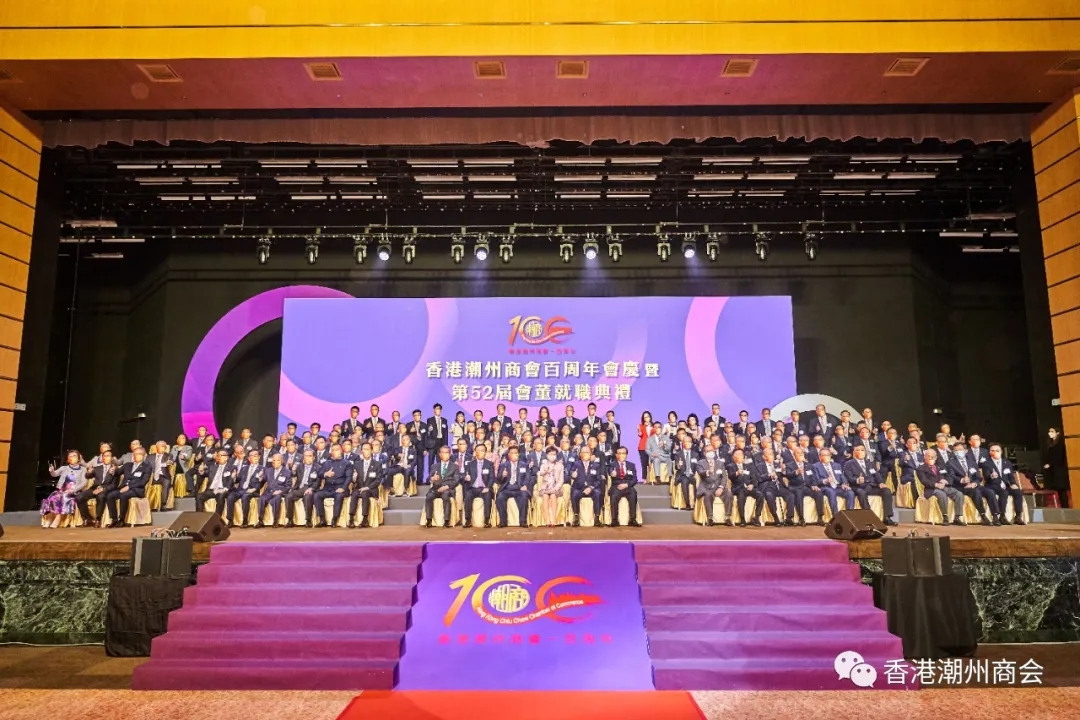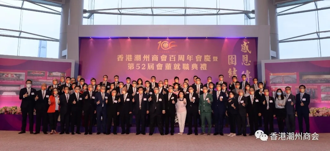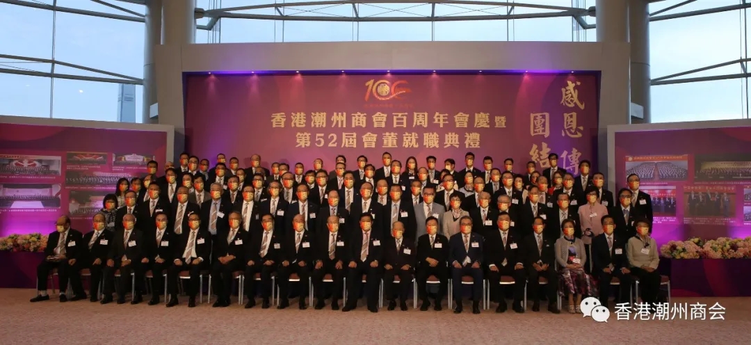 香港潮州商會第52屆會董大合照2021年8月27日,香港潮州商會在香港會議展覽中心新翼大會堂舉行百周年會慶暨第52屆會董就職典禮