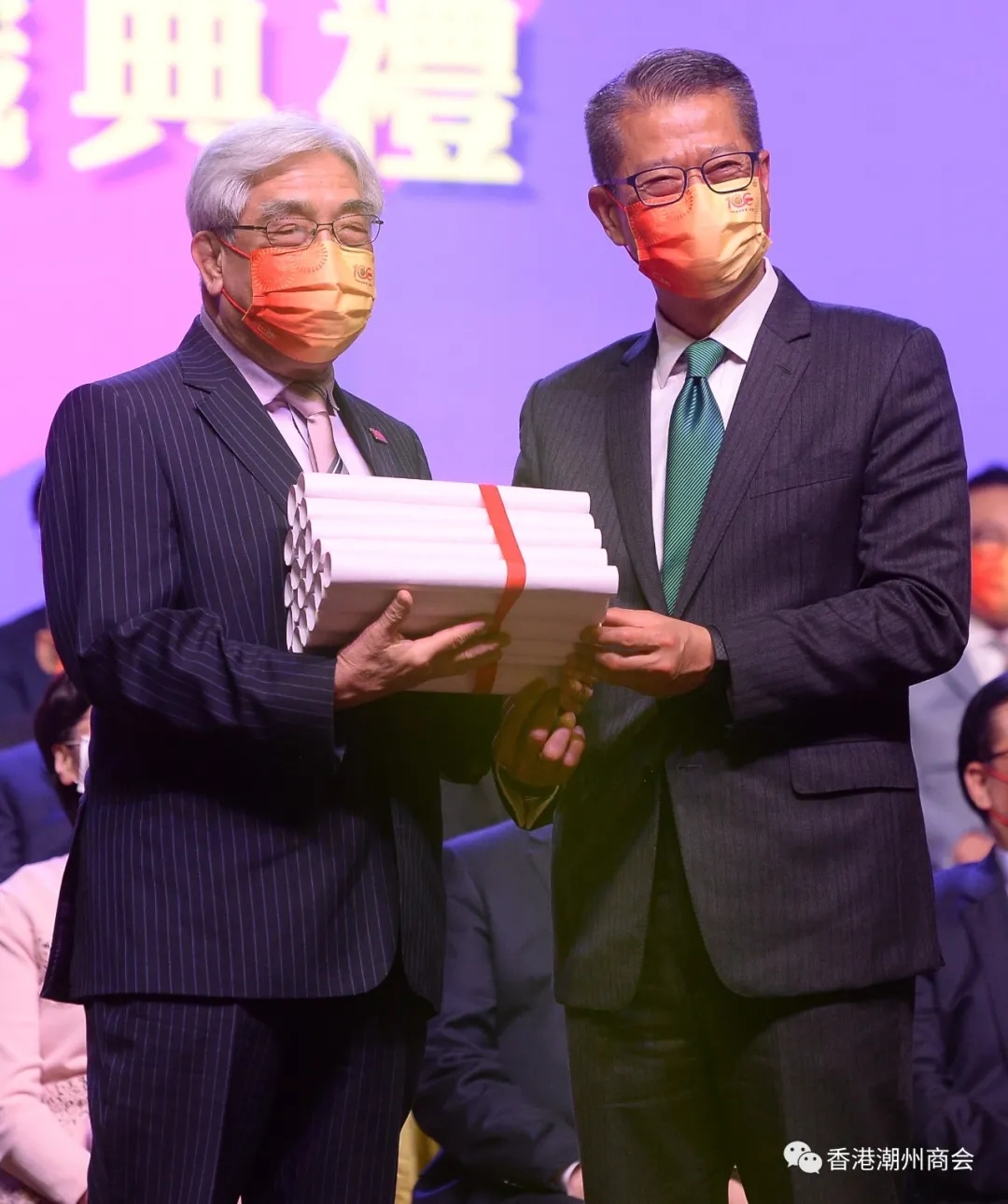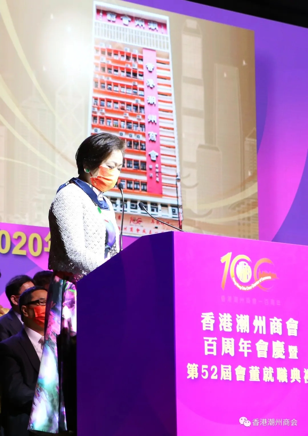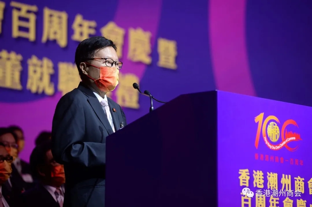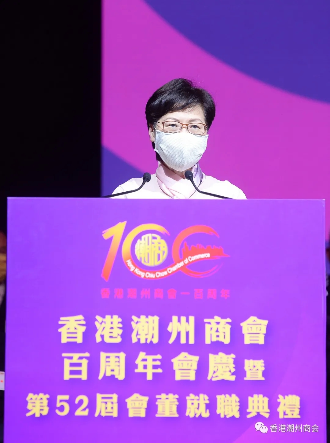 林鄭月娥行政長官致辭時表示,潮籍人士是香港的重要社群,人數超過100萬,扎根香港超過一個世紀,憑着堅毅刻苦的精神、勤勞儉樸的美德,在各行業取得驕人成就,對社會建設和經濟發展建樹良多。她感謝香港潮州商會關心市民福祉,支持特區政府依法施政,維護社會和諧安定。她指出商會植根香港,心繫祖國,積極支持國家改革開放和家鄉經濟發展,多年來向潮汕家鄉和國內偏遠地區捐資辦學,又資助興建文教體育和醫療衞生等大型建設,充分體現愛國、愛港、愛鄉的精神。隨着香港積極參與大灣區建設以及融入國家發展大局,香港人在內地有廣闊的發展空間,青年人在大灣區更有無限機遇。政府會為青年人「鋪橋搭路」,相信商會亦會給予大力支持,協助青年人開創未來。