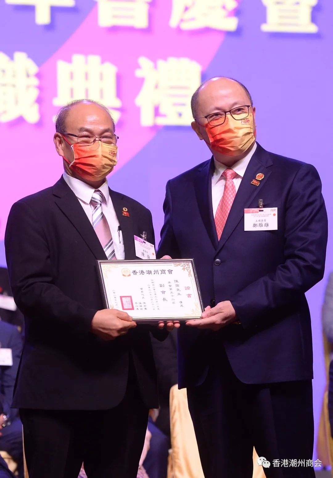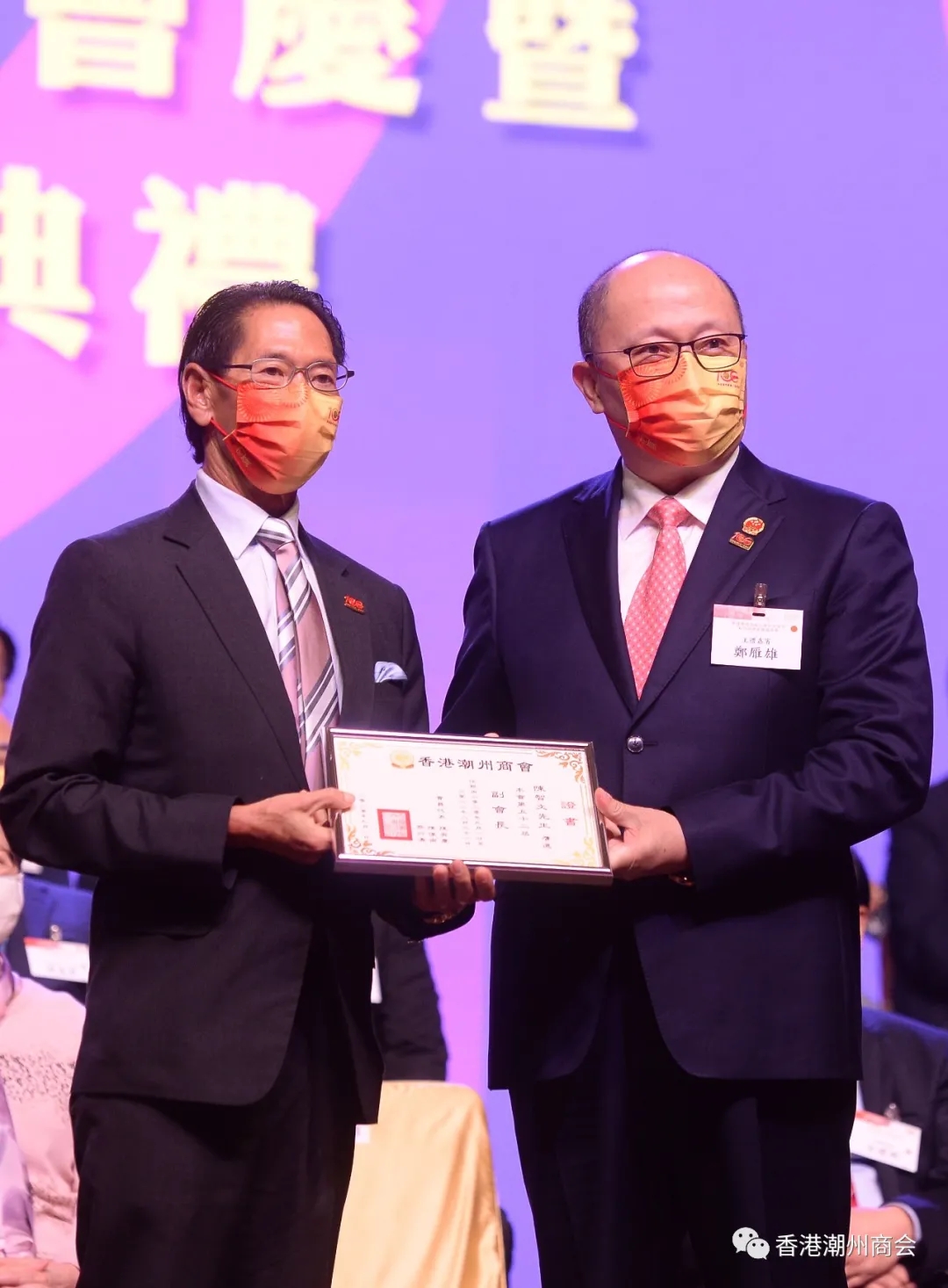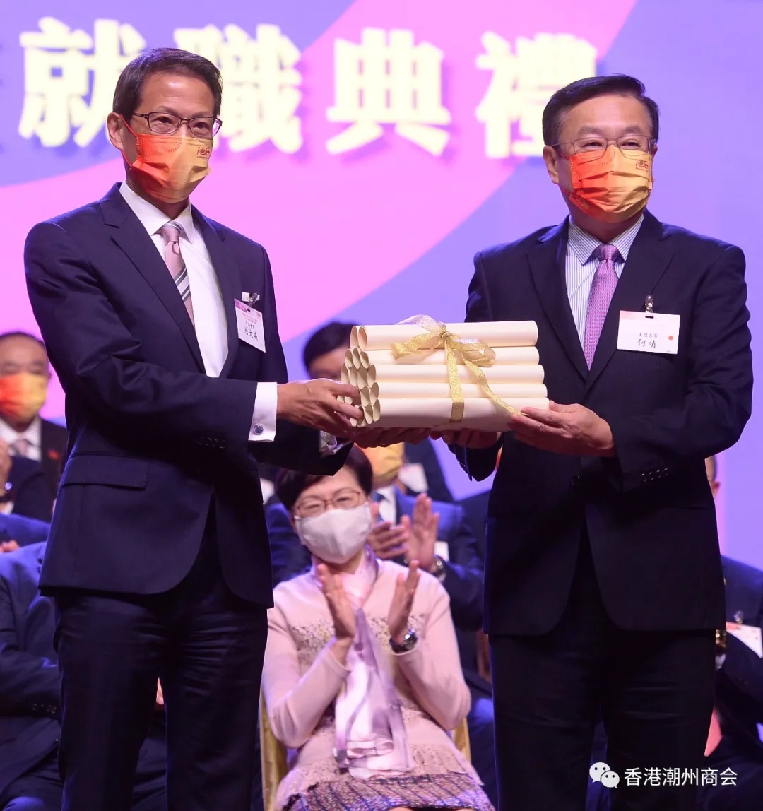 典禮期間,主禮嘉賓林鄭月娥行政長官向黃書銳會長頒發會長證書,駐港國家安全公署鄭雁雄署長向副會長陳智文、馬鴻銘、高佩璇、鄭敬凱、蔡少偉、陳強頒發副會長證書,中聯辦何靖副主任頒發常務會董證書,由唐大威常務會董代表接受,財政司陳茂波司長頒發會董證書,由馬照祥會董代表接受。香港潮州商會正副會長向上屆會長林宣亮先生致送紀念品,感謝他擔任會長期間為商會的會務發展作出的努力。為感謝香港潮州商會歷屆資深會長,香港潮州商會特意從家鄉潮州訂做金漆木雕紀念品送予本會永遠名譽會長。