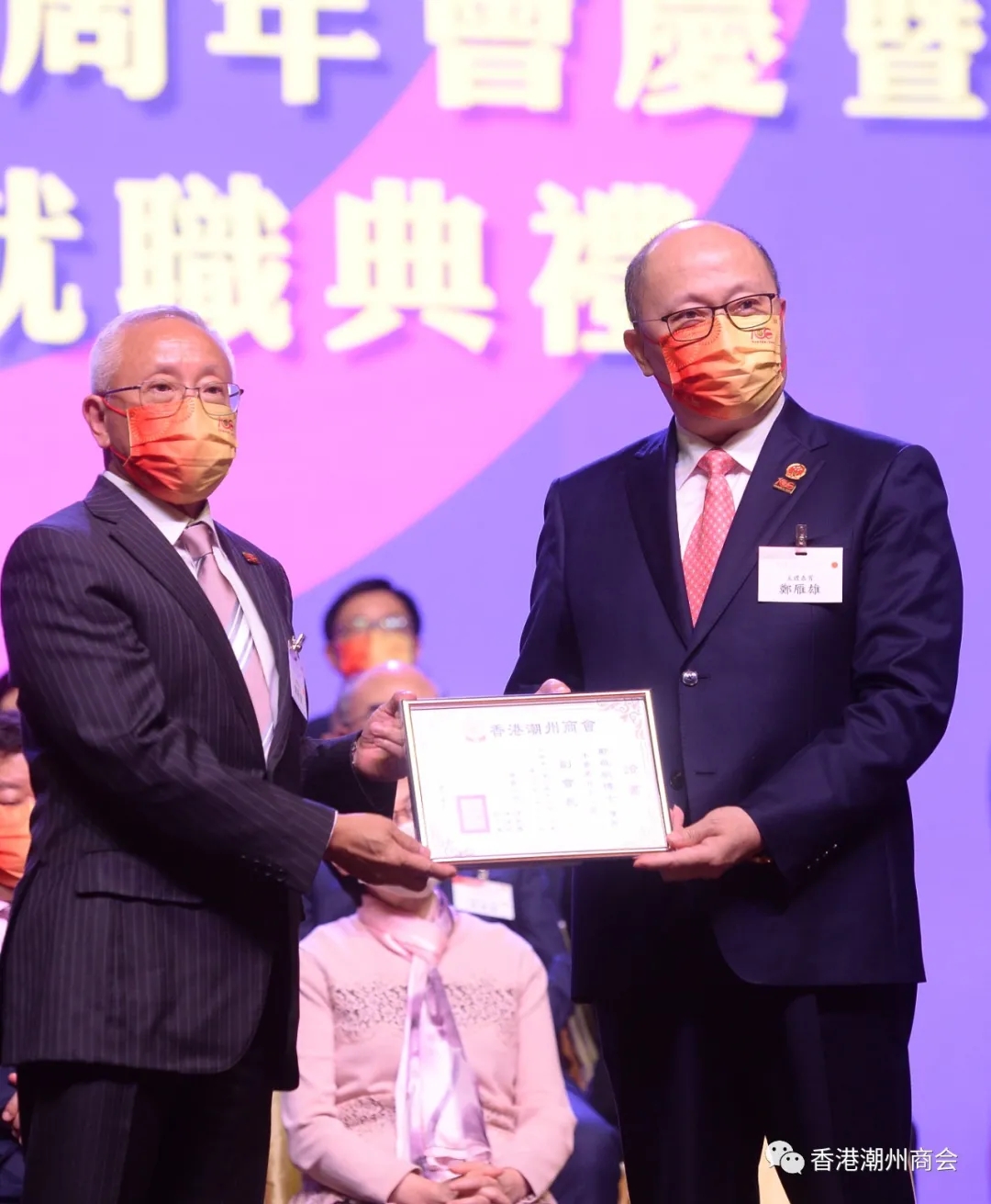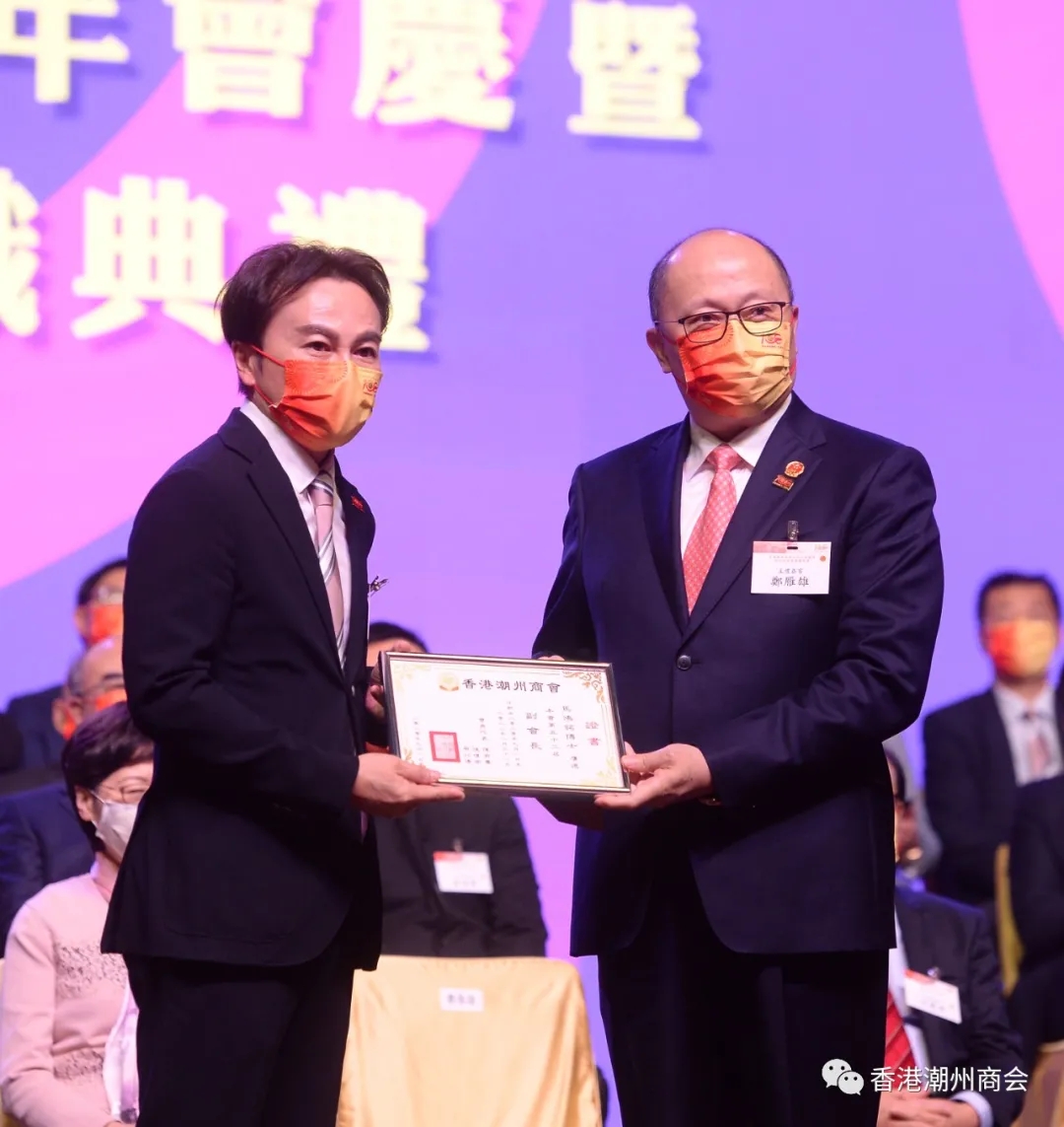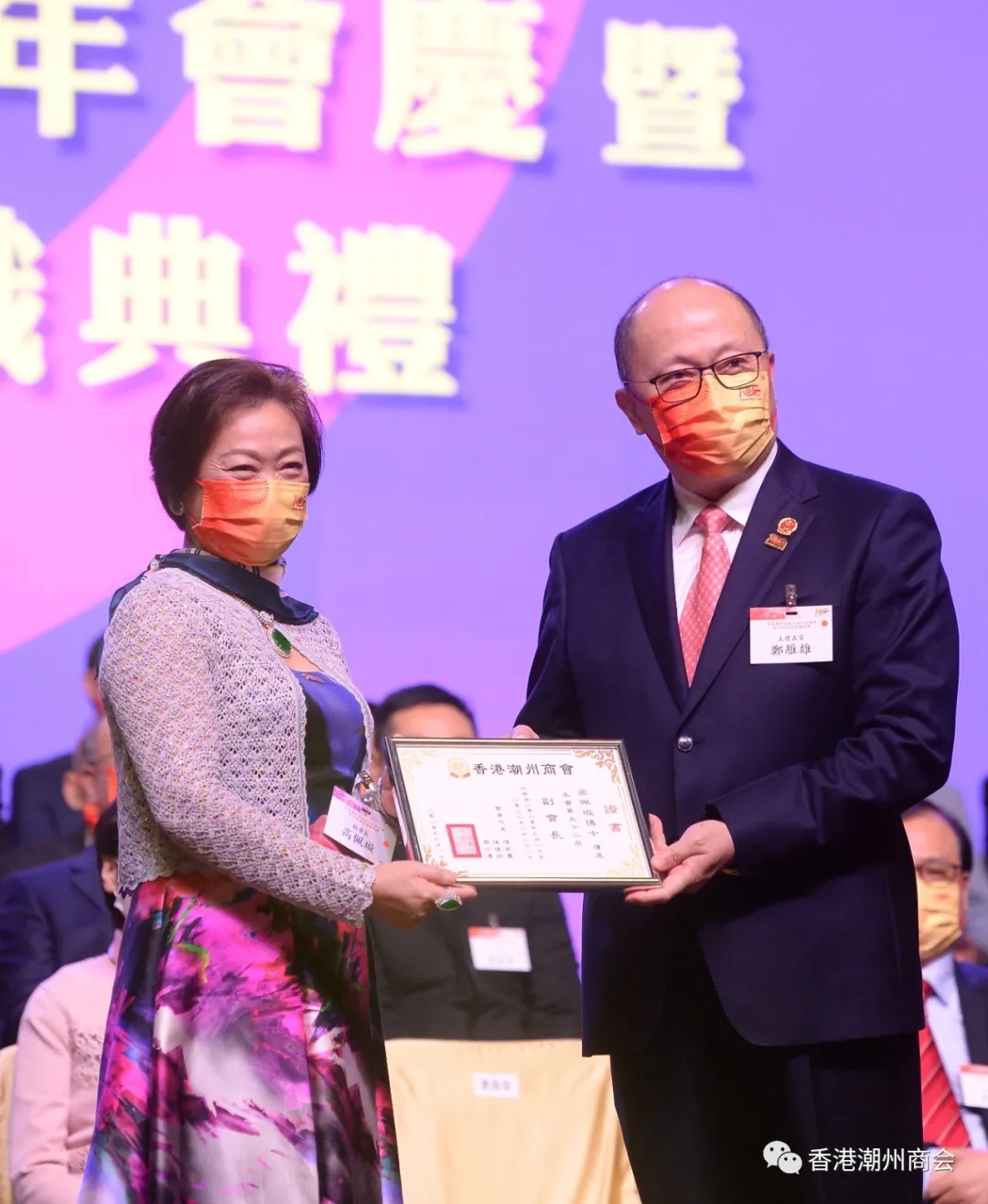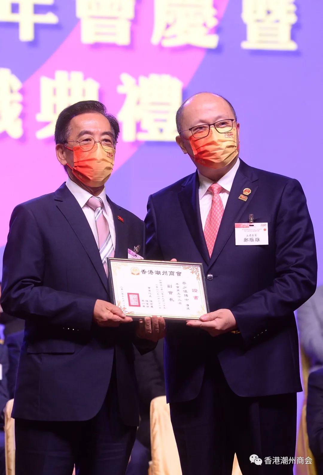 典禮期間,主禮嘉賓林鄭月娥行政長官向黃書銳會長頒發會長證書,駐港國家安全公署鄭雁雄署長向副會長陳智文、馬鴻銘、高佩璇、鄭敬凱、蔡少偉、陳強頒發副會長證書,中聯辦何靖副主任頒發常務會董證書,由唐大威常務會董代表接受,財政司陳茂波司長頒發會董證書,由馬照祥會董代表接受。香港潮州商會正副會長向上屆會長林宣亮先生致送紀念品,感謝他擔任會長期間為商會的會務發展作出的努力。為感謝香港潮州商會歷屆資深會長,香港潮州商會特意從家鄉潮州訂做金漆木雕紀念品送予本會永遠名譽會長。