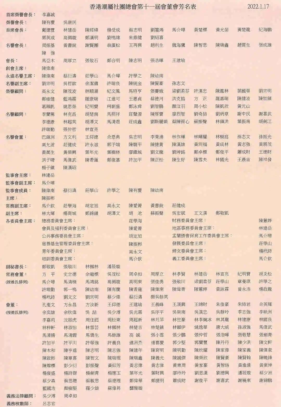 香港潮屬社團總會第十一屆會董會經依章選舉產生。 陳振彬先生榮任新一屆主席,林建岳先生榮任監事會主席, 馬介欽先生、莊學海先生、胡定旭先生、高永文先生、陳愛菁女士、黃書銳先生、莊健成先生榮任常務副主席,林大輝先生、楊育城先生、鄭錦鐘先生、胡澤文先生、胡池先生、蘇振聲先生、吳宏斌先生、王文漢先生、鄭敬凱先生榮任副主席。