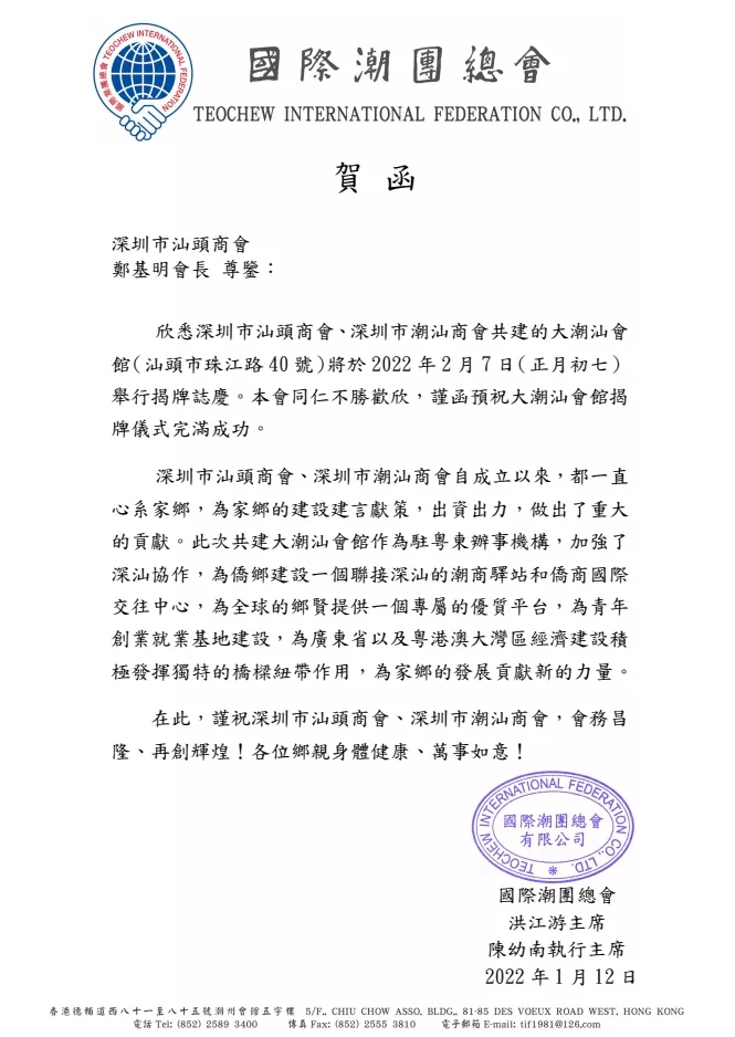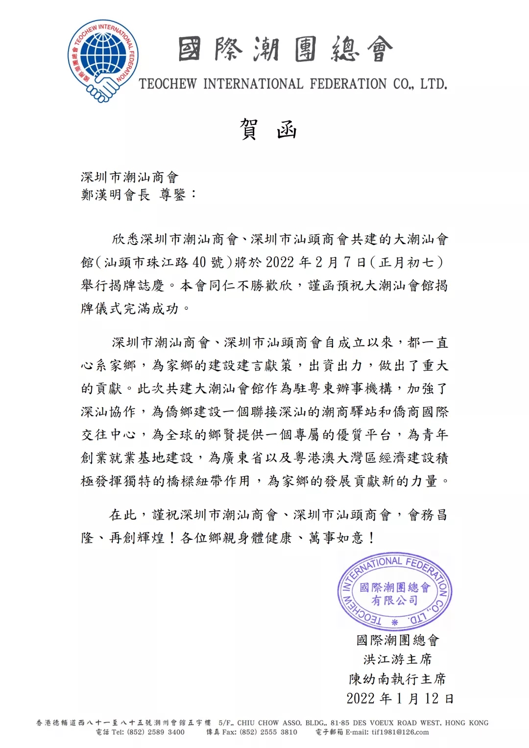 2022年2月7日上午,由深圳市潮汕商會、深圳市汕頭商會共建的大潮汕會館舉行揭牌誌慶,同時舉辦深圳市潮汕商會粵東辦事處、深圳市汕頭商會汕頭辦事處、汕頭工商聯(總商會)社團交流基地、汕頭僑聯僑胞之家和大潮汕影廊揭牌儀式。