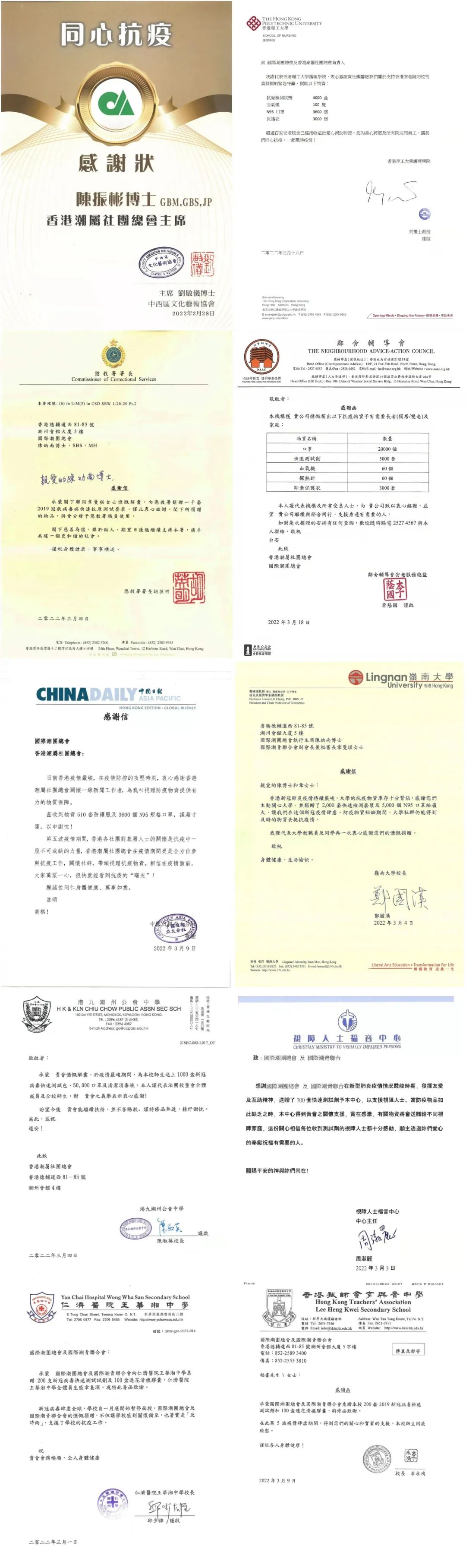 在香港十分嚴峻的第五波疫情爆發的時刻,全球潮人和潮汕家鄉政府馳援香港的抗疫物資如潮水般絡繹不絕湧來,香港潮屬社團總會作為香港一百多萬潮人的代表團體,義不容辭接收了這一份份海內外潮人的心意。連日來,香港潮屬社團總會收到的抗疫物資有N95口罩和普通醫用口罩,快速檢測劑,防護衣,血氧儀,體溫計,連花清瘟膠囊及鄧老清冠飲等中成藥,泰國香米,還有日常用品。我們將這一份份的心意透過香港潮屬社團總會屬下43個團體發給16萬會員及鄉親之外,更以國際潮團總會、香港潮屬社團總會和國際潮青聯合會的名義,贈送給本港逾百團體或學校。(點擊可放大圖片)