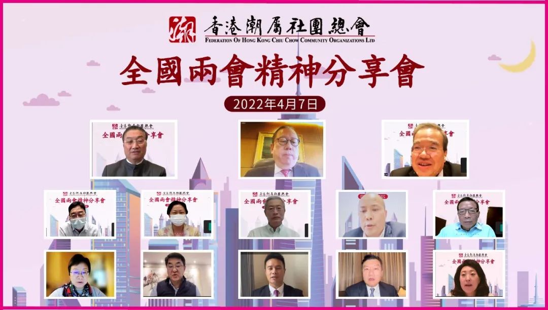 香港潮屬社團總會2022年4月7日舉辦「全國兩會精神」分享會,香港潮屬社團總會首長、會董和各屬會代表六十多人參加了視頻分享會,通過雲交流暢談對全國兩會精神的感想和體會。常務會董、青委執行主席章曼琪主持了分享會,她首先介紹了出席分享會並致辭的首長,他們分別是:全國人大代表、主席陳振彬,全國政協常委、監事會主席林建岳,全國政協常委、常務副主席胡定旭,全國政協委員、常務副主席高永文,全國政協委員、首席會長高佩璇,全國政協委員、榮譽顧問劉炳章,全國政協委員、會長周厚立,全國政協委員、榮譽顧問許漢忠,全國政協委員、榮譽顧問王惠貞,全國政協委員洪明基。另外,全國政協委員、首席會長黃楚標,全國政協委員、首席會長朱鼎健,全國政協委員、名譽會長胡劍江播送了視頻發言。永遠名譽主席許學之,常務副主席馬介欽、莊學海、莊健成,副主席楊育城、鄭錦鐘、胡池、吳宏斌、鄭敬凱等也出席了分享會。